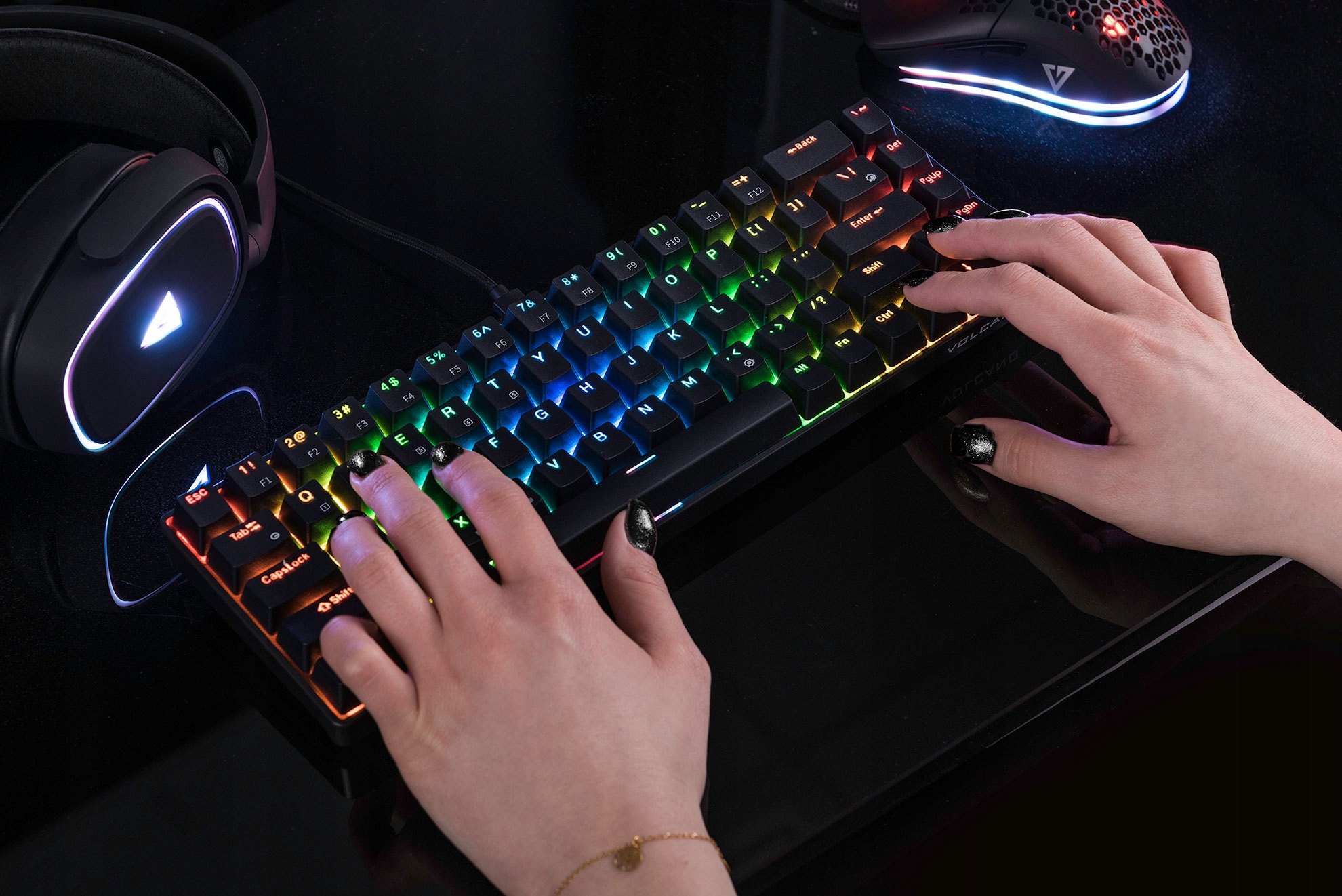 Modecom Volcano Lanparty RGB BT - это 65%клавиатура, что означает, что его небольшой размер является оптимальным выбором не только для игроков (он позволяет вам держать больше места на столе мыши), но и для людей, которые ищут комфорта Написание клавиатуры
