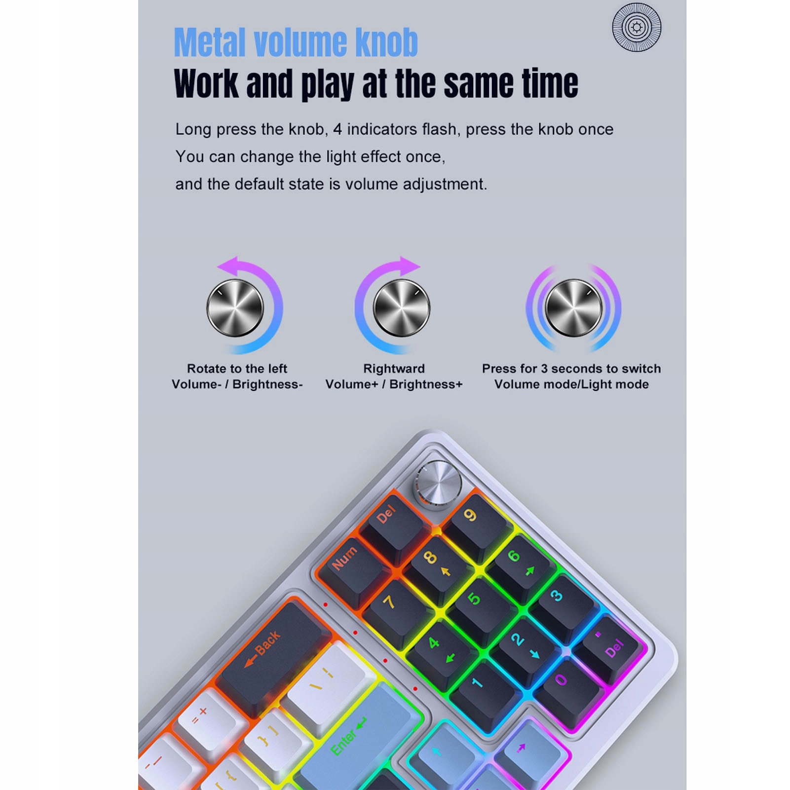 2. Удобный мультимедийный поворот: мультимедийный контроль позволяет быстро регулировать объем и ясность мира. Одиночное прессование легко перегружает режимы подсветки RGB, увеличивая комфорт, обеспечивая быстрые корректировки, не прерывая проход работы.
