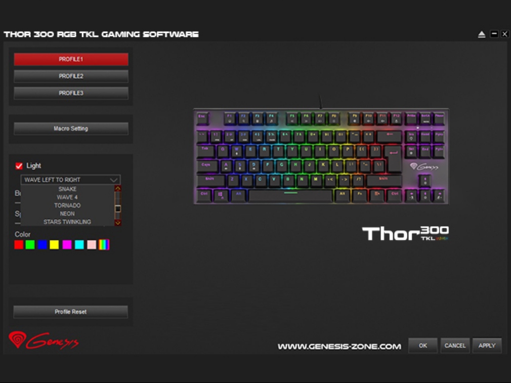 Thor 300 TKL RGB представляет собой единое целое, впечатляющий набор вместе со специальным передовым программным обеспечением. С его помощью вы сможете не только откалибровать подсветку по своим предпочтениям, но и настроить профили и макросы. Он позволяет вам полностью контролировать свое оборудование так, как вам нравится.