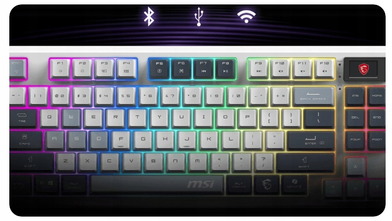 ⭐MSI FORGE GK600 TKL WIRELESS — универсальная клавиатура без цифрового блока. Характеризуется возможностью работы как в беспроводном режиме 2,4 ГГц и Bluetooth, так и в проводном режиме. Он оснащен линейными механическими переключателями с возможностью горячей замены, прочными колпачками клавиш из полибутилентерефталата (ПБТ), звукопоглощающими прокладками и 1,06-дюймовым дисплеем. Благодаря RGB-подсветке и аккумулятору повышенной емкости на 4000 мАч это идеальное устройство для геймеров и творцов.