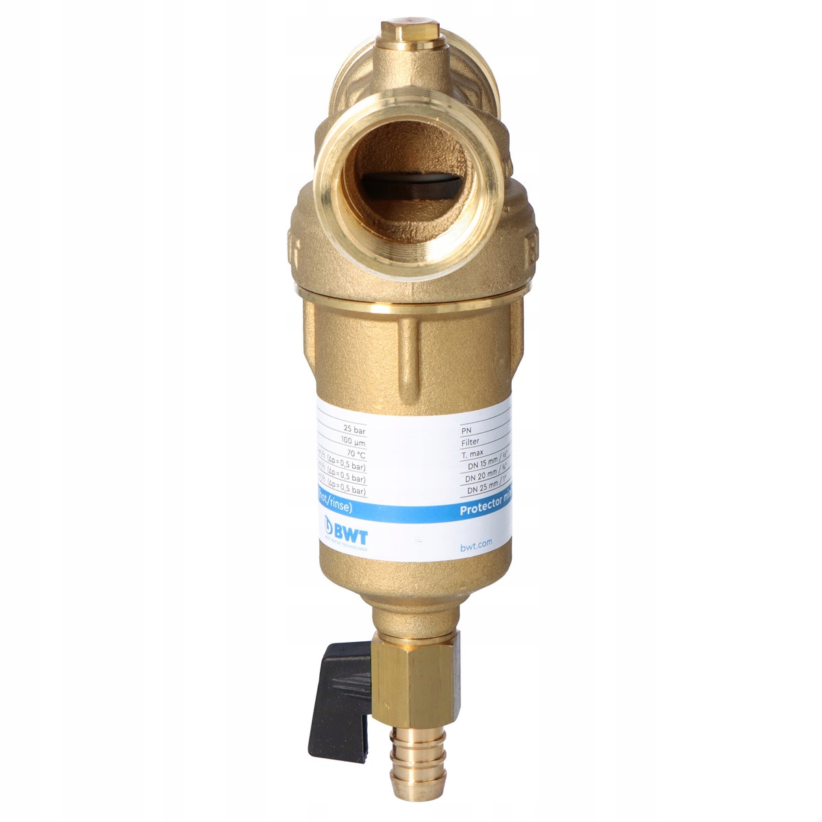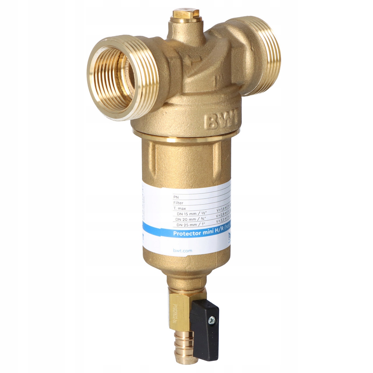 BWT PROTECTOR mini H/R фильтр для горячей воды 1" Механический фильтр с промывкой, с ручным управлением для фильтрации воды при температуре до 70°C. Корпус полностью из латуни, сливной клапан для скопившихся примесей, соединительная арматура с уплотнениями, фильтрующий элемент из нержавеющей стали. Фильтр сертифицирован PZH. - номинальный диаметр соединения: DN 25 (1") - эффективность при ?p=0,2 бар: 3,5 м3/ч - эффективность фильтрации: 100 м - номинальное давление: 25 бар - рабочее давление: 1,5 (при полоскании) 25 бар - температура воды: 70°C - температура окружающей среды: 40°C - монтажная длина: 184 мм - общая высота: 194 мм