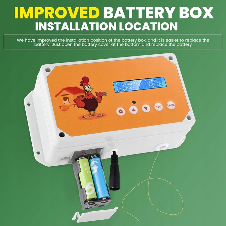 Открыватель дверей курятника оснащен таймером и пультом дистанционного управления, вы можете установить время автоматического открытия и закрытия двери, используя режим таймера, или вы можете использовать пульт дистанционного управления (дальность действия около 50 м) или кнопки на панели для открытия и закрытия двери. Если вы хотите включать и выключать его вручную, просто нажмите кнопку «ТЕСТ».