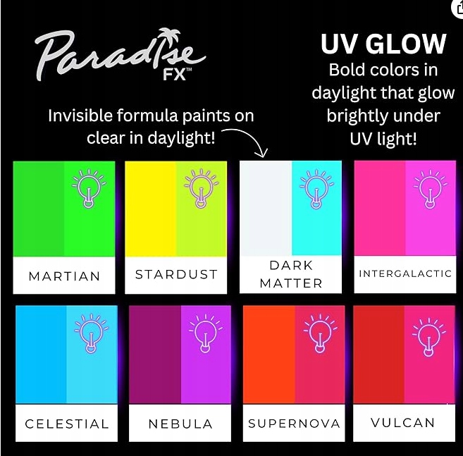 - Марсианский – флуоресцентный зеленый/. Зеленый УФ, Звездная пыль — флуоресцентный желтый/желтый УФ, Темная материя — прозрачный/синий УФ, Межгалактический — неоновый розовый/коралловый УФ, Вулкан — неоновый красный/розовый УФ, Целел. ste - Неоново-синий. e/Light Blue UV, Nebula – Neon Purple/Purple UV, Super Nova – Neon Orange/Orange UV