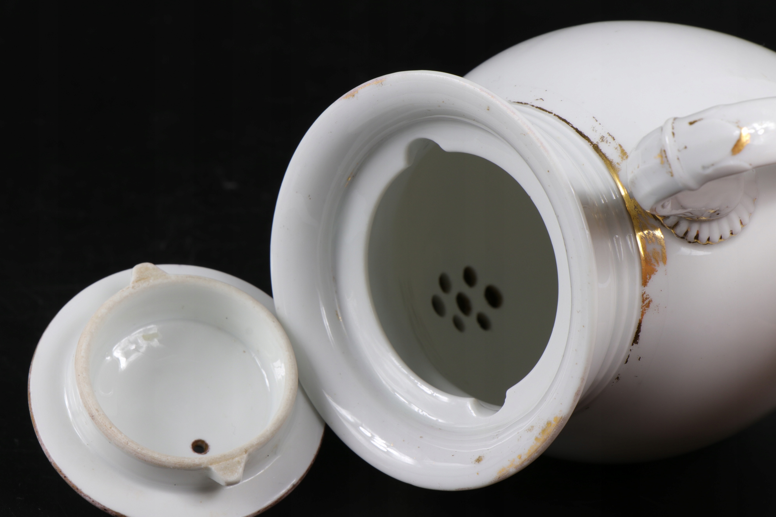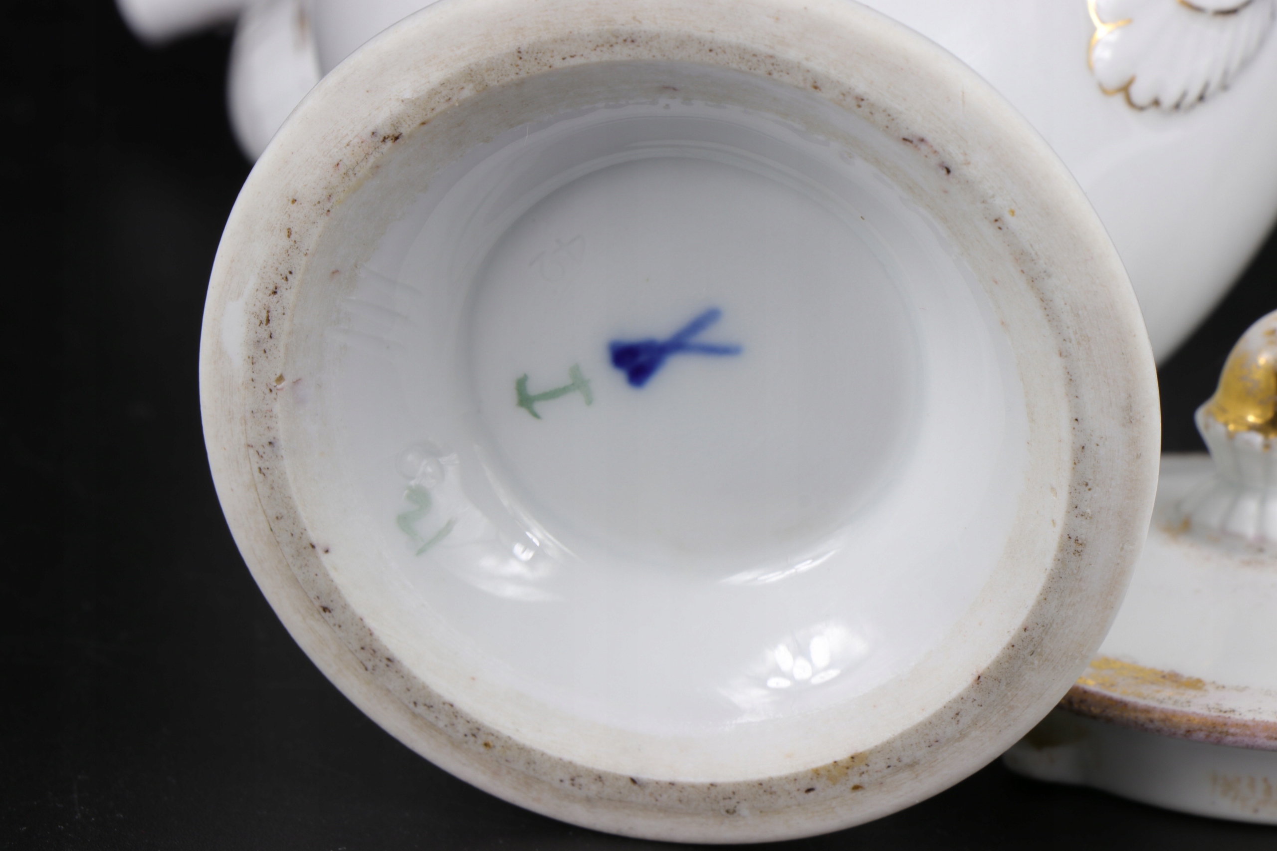 Как видно на фотографиях. Фарфор в очень хорошем состоянии, без трещин и повреждений. Видимые потертости позолоты.