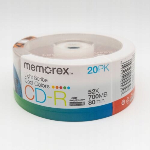 Memorex CD-R LIGHTSCRIBE COLOR 20 шт. Коробка для торта емкостью 700 МБ и скоростью записи до 52x. На этих дисках можно печатать монохромные этикетки с помощью специальных записывающих устройств и программного обеспечения Lightscribe. Доступные цвета и количество в упаковке 20 шт.: синий 5 шт, зеленый 5 шт. , красный 5 шт. , оранжевый 5, желтый 5.. Упаковка коробка для торта 20.