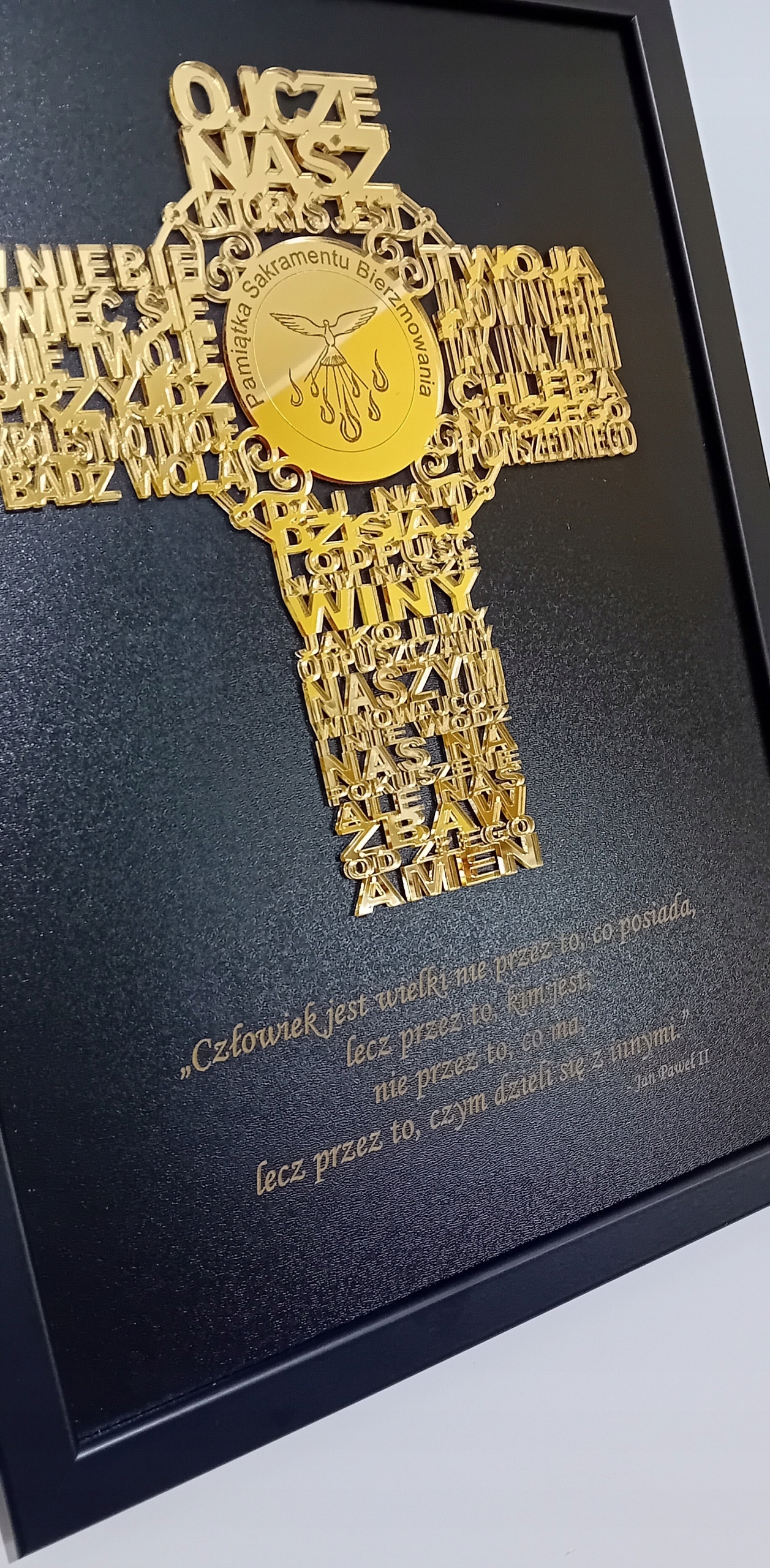 Золотой крест с молитвой «Наш отец» вырезан из 3 -миллиметрового зеркального плексигласа, расположенного на черном фоне с персонализированными пожеланиями.