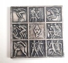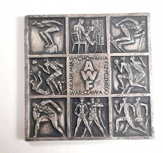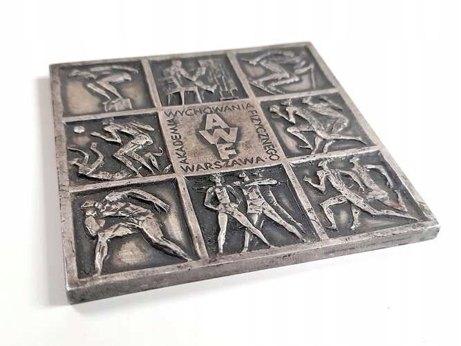 Состояние: Видимые следы использования в ХОРОШЕМ Описание: Старая памятная доска/медаль периода Польской Народной Республики, выпущенная Академией физического воспитания в Варшаве, с изображением различных спортивные дисциплины и занятия студентов AWF. Посередине название университета. Табличка односторонняя, изготовлена из посеребренной латуни.