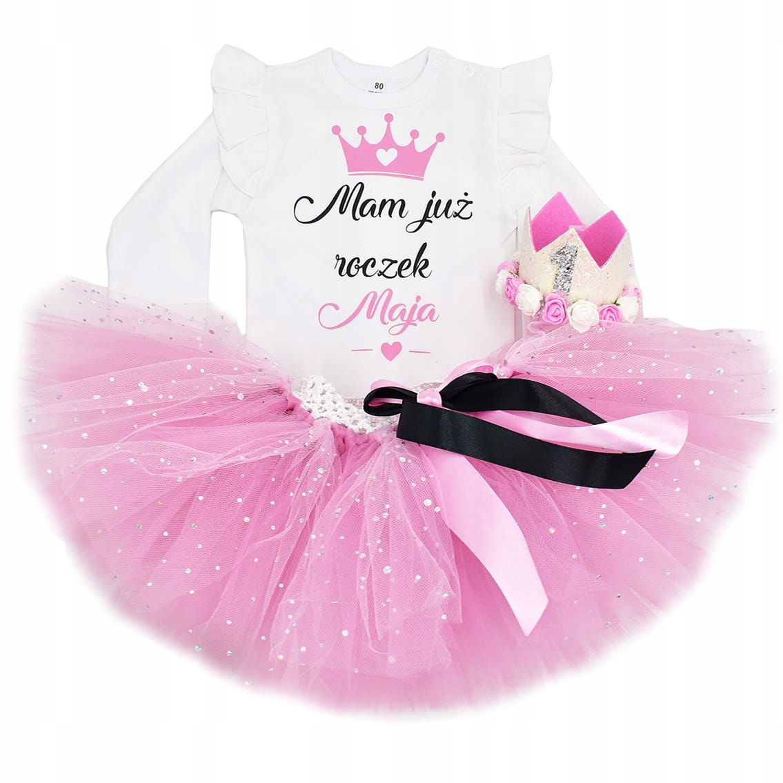 В комплект входят: боди с рюшой с надписью МНЕ УЖЕ ГОД и любым именем девочки. Юбка ТУТУ грязно-розового цвета с добавлением фатина и пайеток выполнена в универсальном размере, адаптированном под размер боди. В комплект входит ободок-корона в том же цвете.