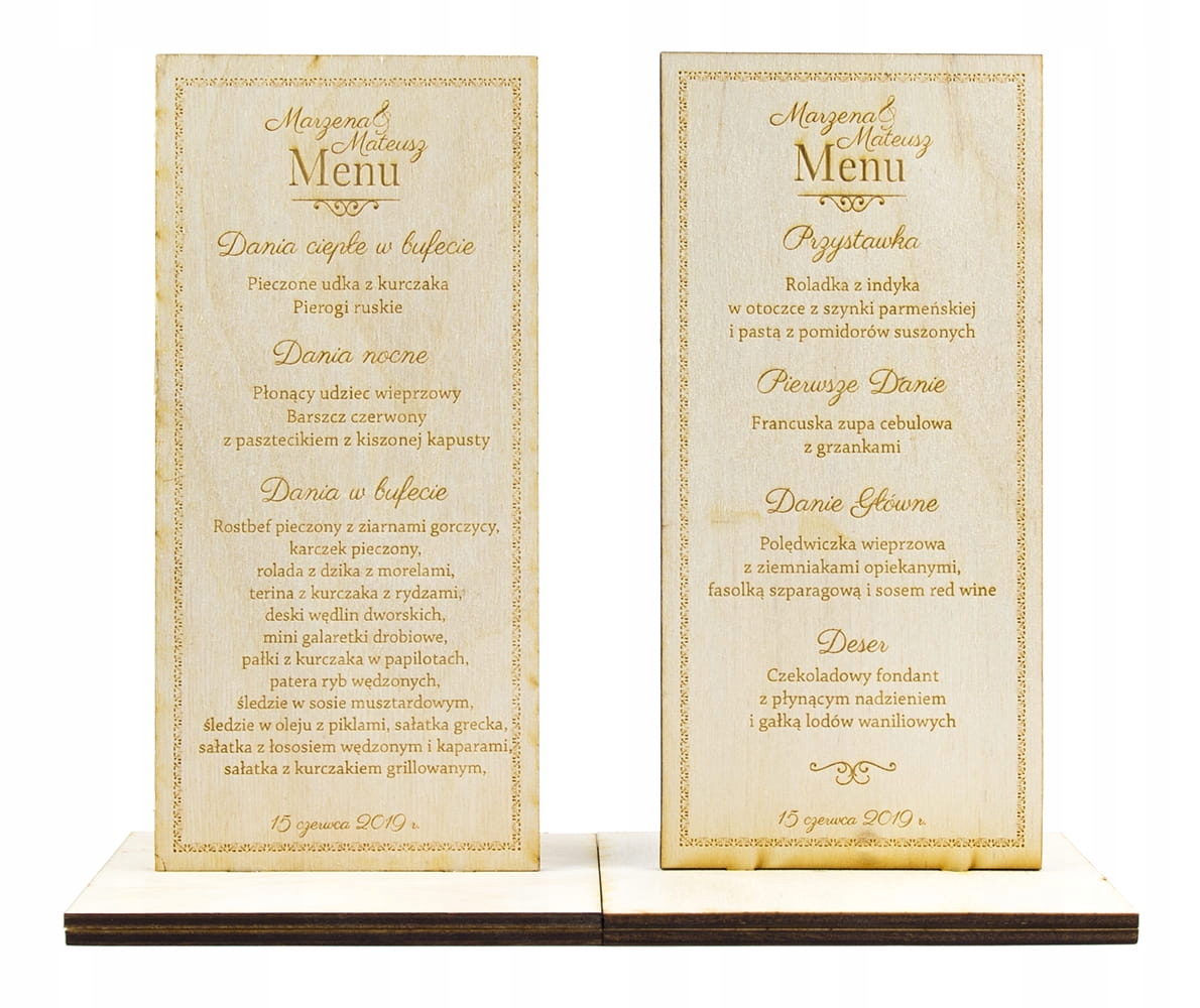 Деревянное меню отлично смотрится на свадебном столе и является практичным дополнением для гостей свадьбы. Часто, будучи гостем на свадьбе, после того, как съели какое-то блюдо, мы задаемся вопросом, что же так возбудило наши вкусовые рецепторы. Свадебное меню решает эту проблему, и каждый присутствующий на церемонии сможет узнать, что он только что съел.