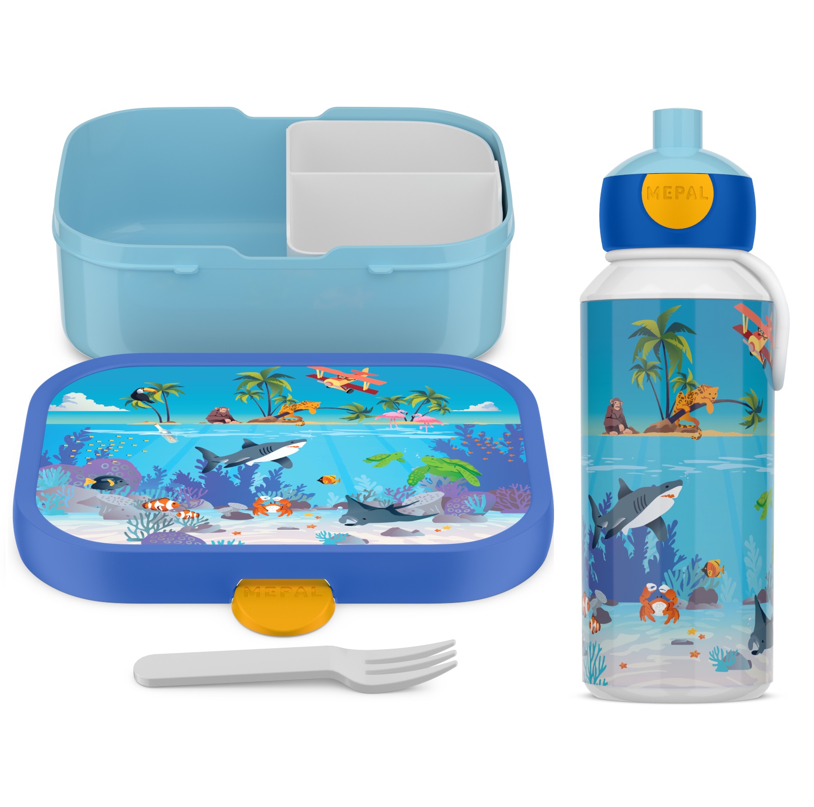 Практическая, безопасная для здоровья для детского завтрака, сэндвич -контейнера и бутылки с водой с тропическим океаном мундштука. h1> не содержит вредного епископа епископа h1> идеально подходит как для школы, так и для различных типов поездок. Mepal