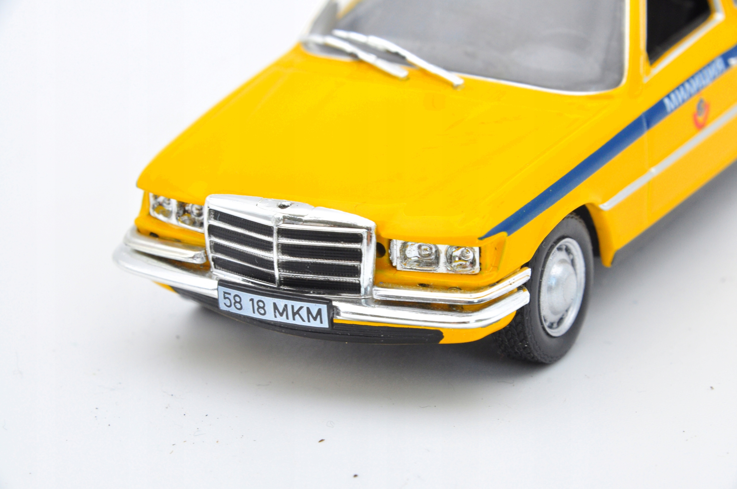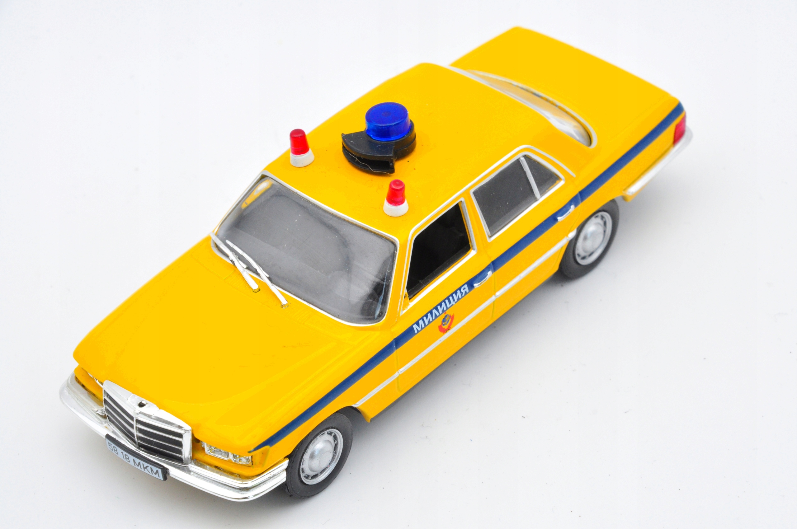 Модель Resorak показывает Mercedes Benz 450Sel в полицейской версии. Его интенсивный желтый цвет с голубым поясом привлекает глаз, а детали, такие как крыше, дают ему характер. Тело изготовлено из металла, что делает модель прочной и долговечной. Кроме того, пластиковые элементы, такие как стекло, хорошо сопоставлены, что подчеркивает качество мастерства. Несмотря на небольшие царапины, модель сохраняет свое очарование, что делает его привлекательным для коллекционеров.