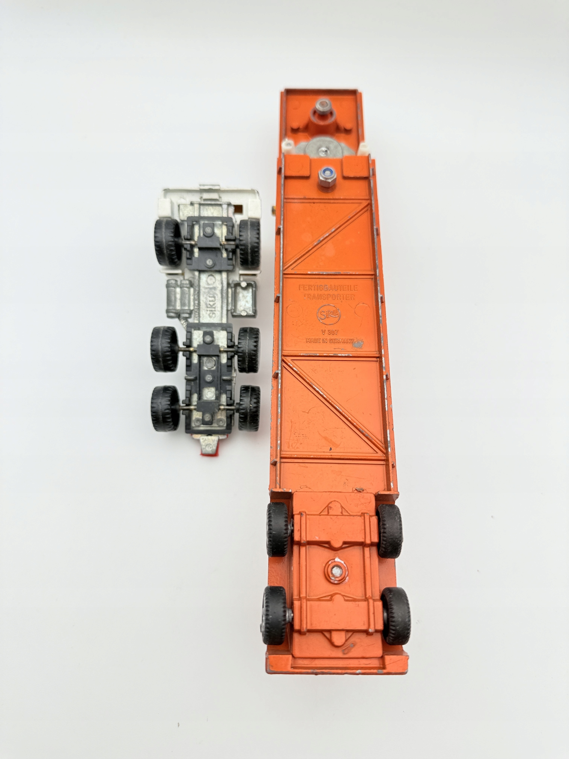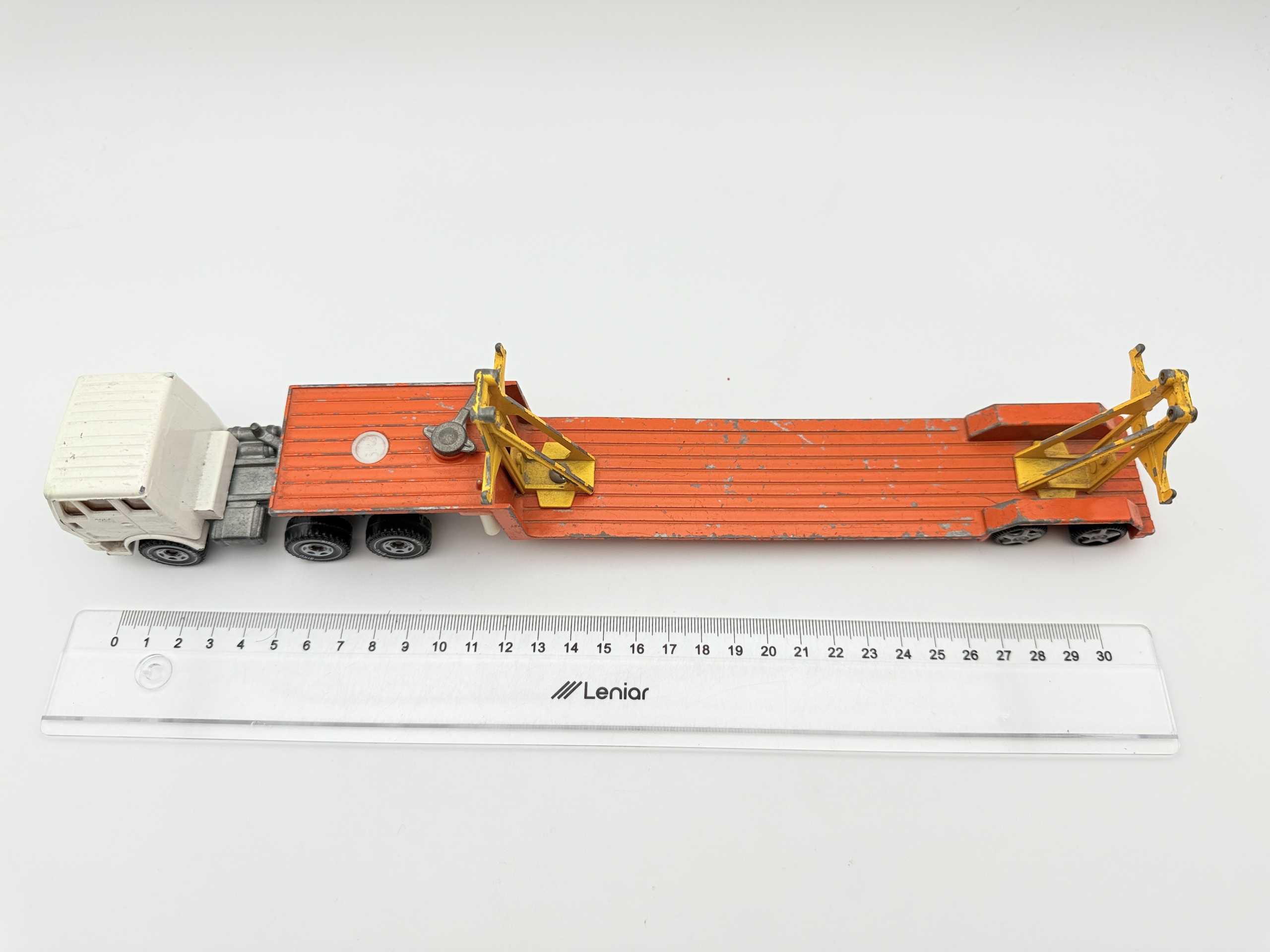 Эта весна — настоящий праздник для коллекционеров, ценящих как эстетику, так и функциональность. На модели представлен транспортер с белой металлической кабиной и оранжевым пластиковым прицепом, оснащенным двумя желтыми домкратами для крепления груза. Ресорак масштабом 1:55 и длиной 314 мм впечатляет детализацией и реалистичным внешним видом. Сделано в Германии, оно сохраняет качество изготовления, типичное для бренда Siku.