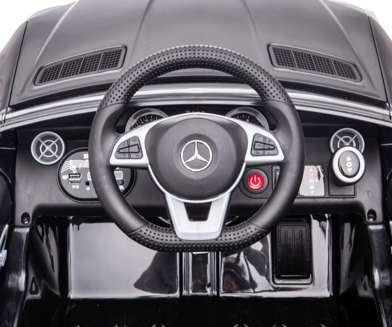 Транспортное средство лицензии Mercedes гарантирует большое внимание на самые маленькие детали и качество используемых материалов. Автомобиль является верной копией SLC-300. На приборной панели есть имитационные часы , панель для мультимедийной службы (регулятор громкости, вперед и назад) вместе с USB -входом, SD и Aux Card. Кнопка «режим» позволяет прослушать 5 загруженных мелодий и 5 сказок . Чтобы выключить или поднять песню, вы должны держать ключ прокрутки "v+" или "V-". На правой стороне рулевого колеса есть кнопка уровня скорости: "Низкая скорость" и "высокая скорость" и разъем переключения передач (вперед, нейтральный и назад). b> p>