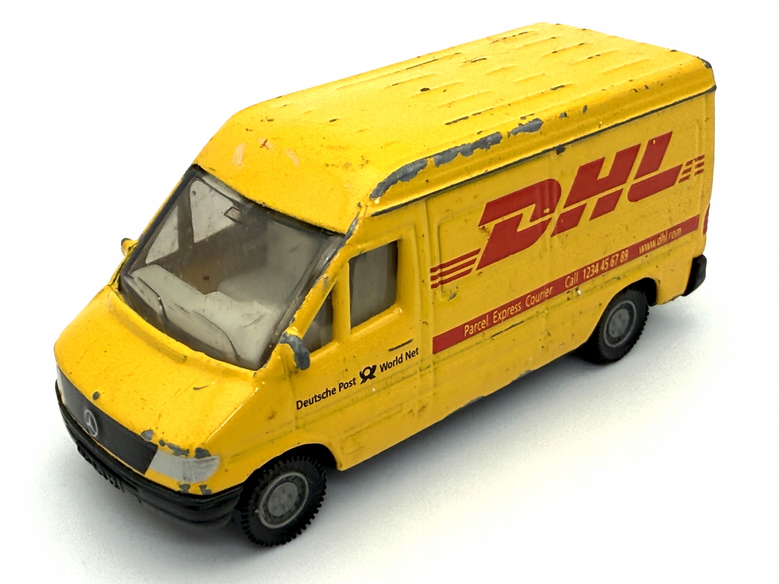 Этот рерак-спринтер Mercedes-Benz по шкале 1:55 является отличным примером сочетания качества изготовления с вниманием к деталям. Модель показывает желтый фургон с характерными красными надписями DHL и дополнительными Deutsche Post и World Net Markings. Сделано в основном из металла, что обеспечивает прочность и долговечность, но с видимыми следами использования, такими как царапины и скопление краски. Длина модели составляет 82 мм, и дополнительным преимуществом является буксир сзади. Дно модели черное с маркировкой производителя Siku и номером каталога «0804». Его реалистичное воспроизведение делает его привлекательным элементом для коллекционеров.