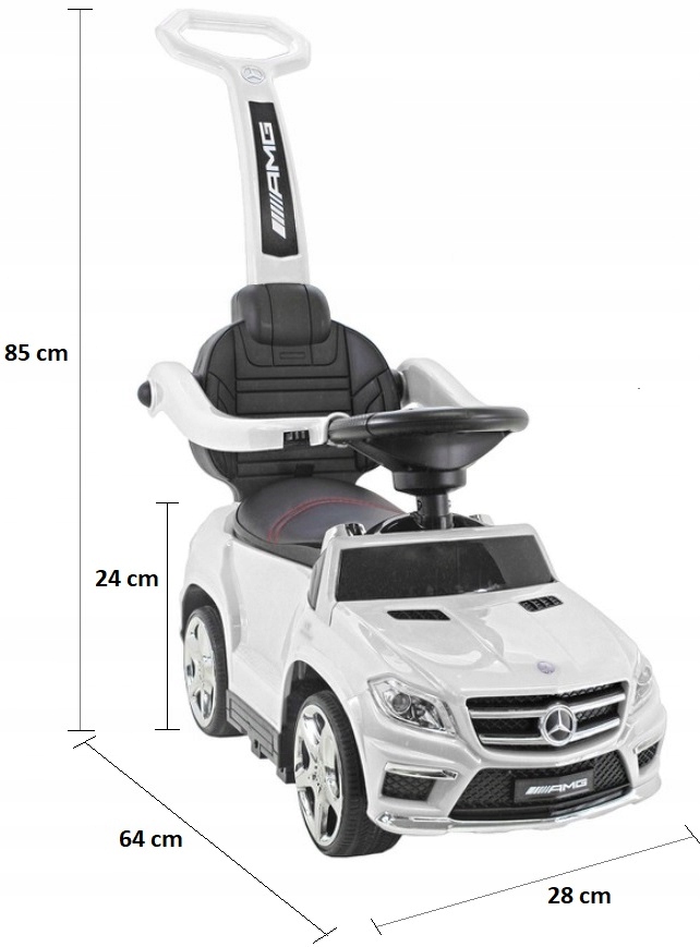 Автомобиль Mercedes GL63 AMG невероятно привлекателен, возбуждает чувства музыкой, звук двигателя, гудка и света. Он прочно сделан, оснащен поворотными большими резиновыми колесами и отделением под сиденьем для хранения детских сокровищ.