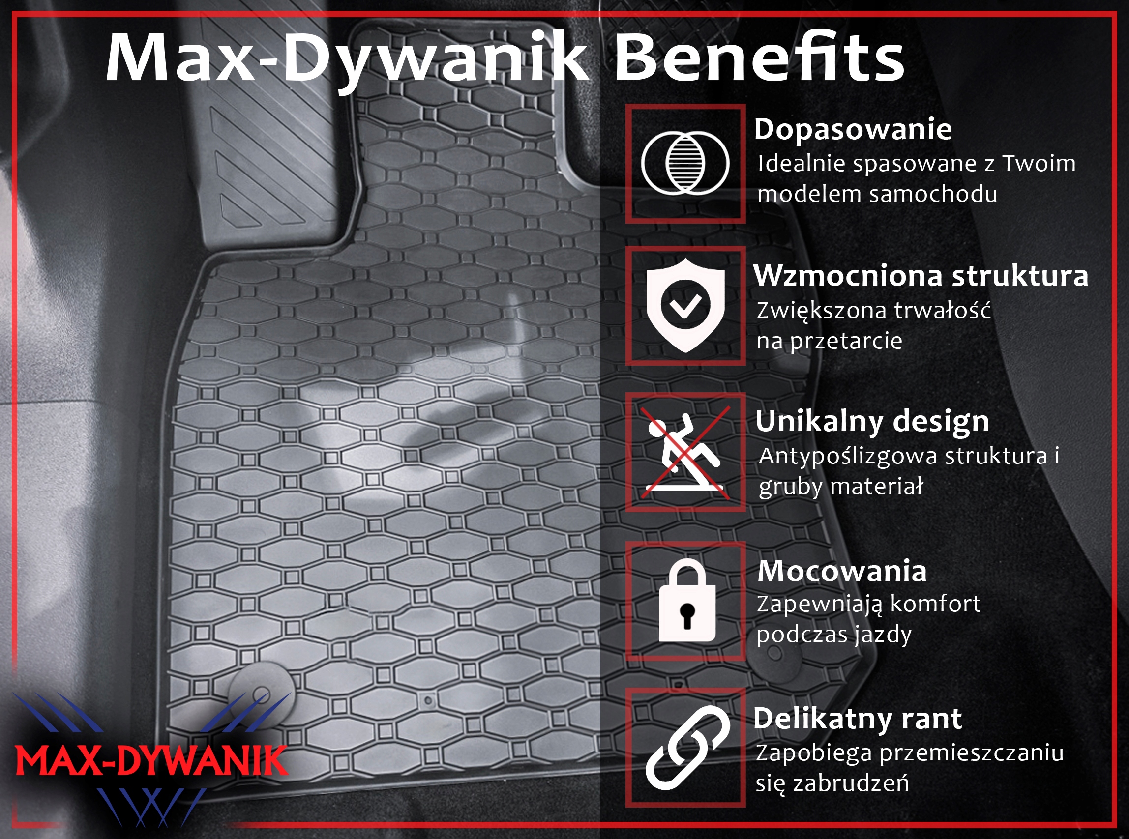 предлагаемые коврики были точно разработаны для формы пластины пола, с учетом не только бренда / модели автомобиля, но и года, а также в обоснованных случаях версии кузова. Коврики изготовлены из самого высокого качества , прочной и армированной резиновой смеси, которая не содержит веществ, вредных для здоровья, что обеспечивает безопасность использования. эстетический защитный воротник вокруг ковров эффективно останавливает воду и грязь, защищая оригинальную обивку автомобиля от грязи. Коврики снизу спроектировали крошечные шипы, которые дополнительным образом защищают их от движения. Коврик водителя был дополнительно укреплен в самом чувствительном месте (место контакта пятки с поверхностью коврика), чтобы защитить коврик от истирания.