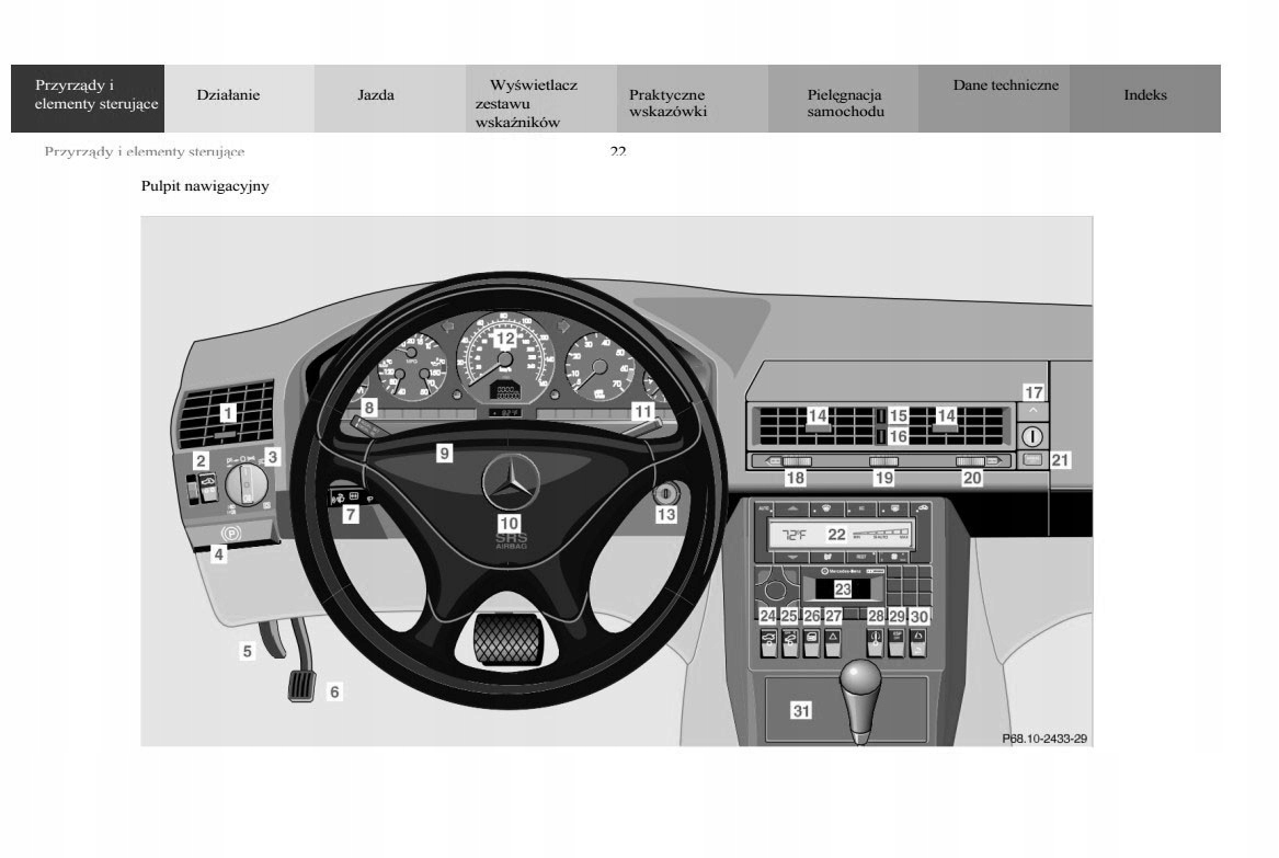 Руководство по эксплуатации Mercedes содержит все версии оборудования и полезную информацию о том, как эффективно и безопасно использовать автомобиль, например. - индикаторы, контрольные лампы, открытие и закрытие - освещение и обзорность, сиденья, отсеки для хранения вещей, отопление, вентиляция, кондиционирование - советы по вождению, эксплуатации, обслуживанию автомобиля - уровни жидкостей, проверка и доливка, аварийные операции, замена колес, предохранители, замена лампочек - технические данные... и многое другое, дающее путешественникам ощущение безопасности и комфорта. Польское законодательство обязывает продавца приложить к автомобилю руководство по эксплуатации на польском языке. Руководство пользователя автомобиля новое и на польском языке.
