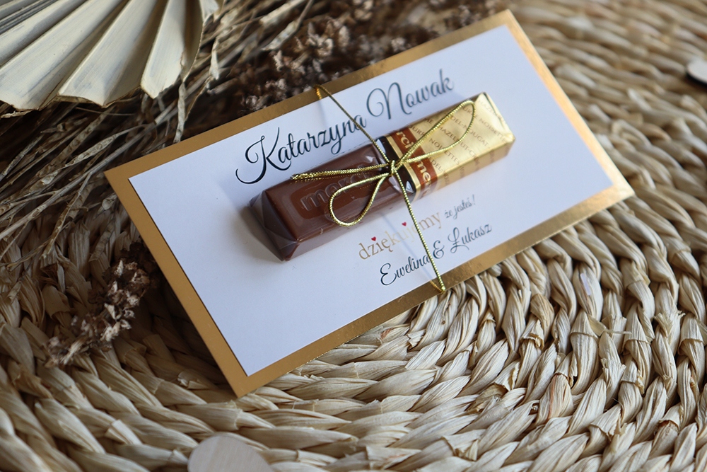 Изящное благодарственное письмо для гостей с шоколадом «Мерси» на выбор из с золотой основой.