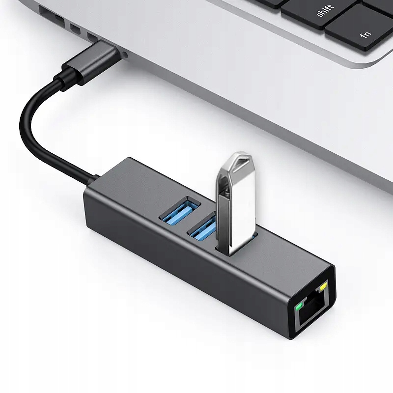 Переходник — отличная альтернатива WI-FI. Он позволяет расширить ноутбук, планшет или ПК с помощью разъема USB-C дополнительным портом Ethernet RJ45. Кроме того, он имеет 3 входа USB 3.0.