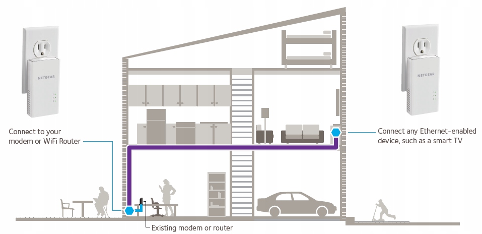 NETGEAR Powerline — один из самых простых способов расширения возможностей. дальность проводного доступа в Интернет в новые помещения без необходимости использования длинных кабелей. Просто подключите адаптер Powerline 1000 к любой электрической розетке и подключите устройство к порту Ethernet. Да, это действительно так просто.