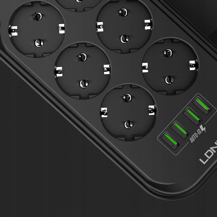 LDNIO SE6402 - надежный удлинитель, благодаря которому мы можем подключить 10 устройств одновременно. Шесть устройств подключаем со стандартными вилками питания, еще четыре — к портам USB, которые автоматически подстраивают ток подключаемого устройства, максимум до 3,4А.