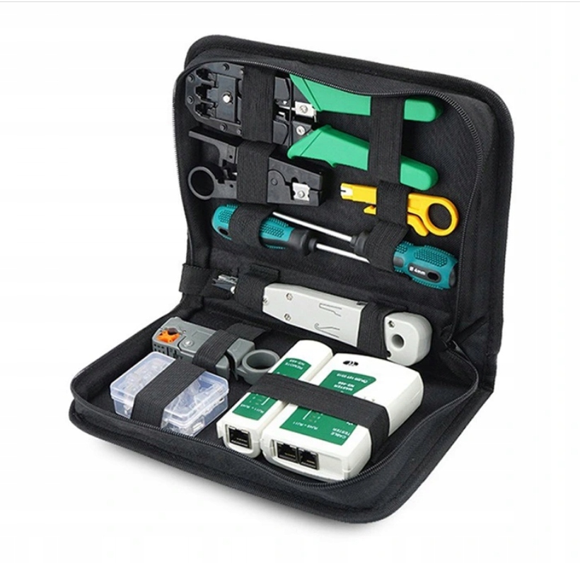 для обслуживания сети, упакованный в удобный кейс. Органайзер имеет специальные профилированные резинки, благодаря которым каждый инструмент имеет свое место и всегда под рукой. Набор позволяет диагностировать и устранять любые неисправности сетевых кабелей, короткие замыкания, ошибки или нарушения проводимости.