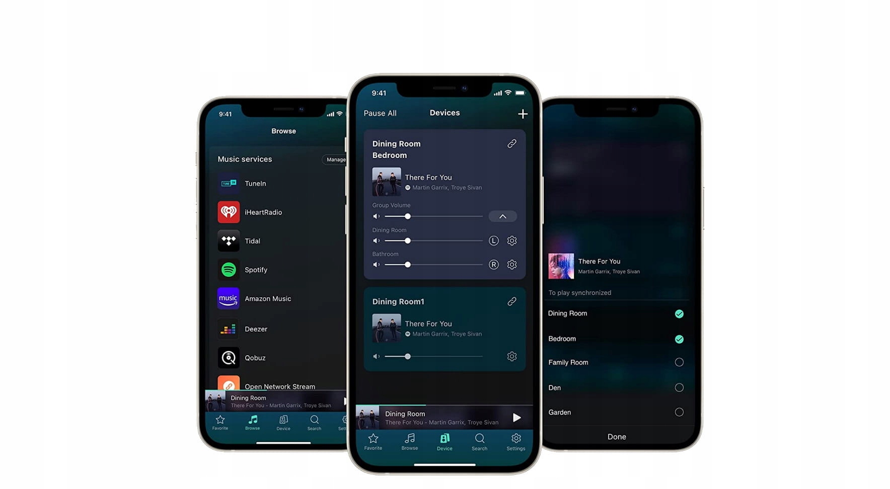 - Потоковое воспроизведение Spotify, Amazon Music, Deezer, Tunein, Tidal, Qobuz, SoundCloud, Pandora, iHeartRadio, Napster, Soundmachine, Calm Radio и других.