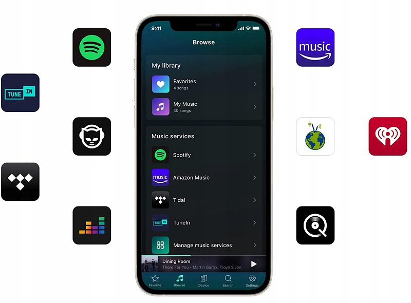 - Источники потоковой передачи: Spotify, Amazon Music, Deezer, Tunein. , Tidal, Qobuz, iHeartRadio, Napster, Soundmachine и т. д.