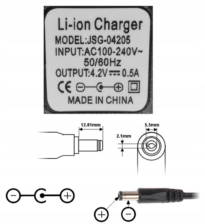 - 4,2 В. 2А. - штекер: 5,5 мм. x 2,1 мм.