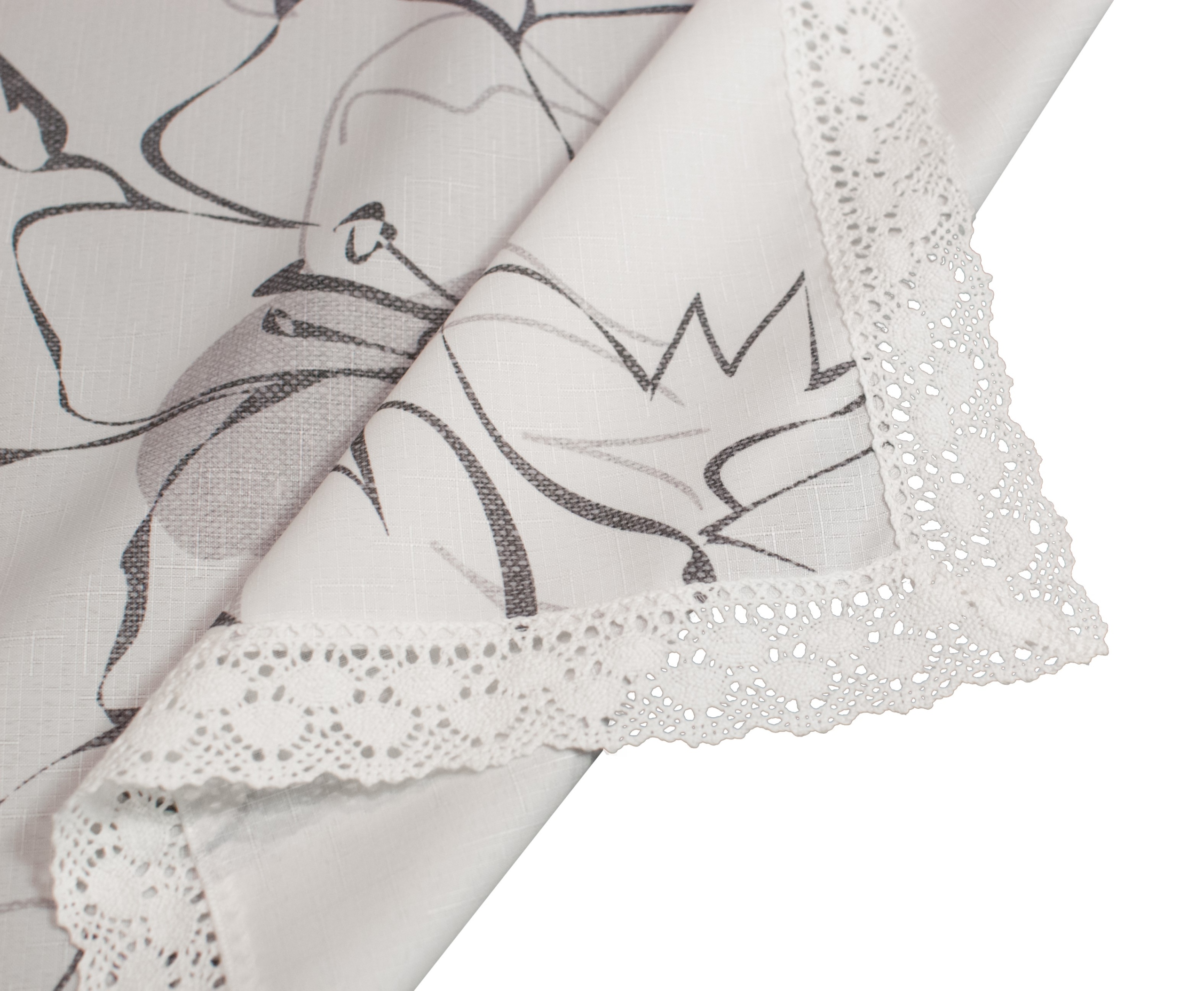 Ткань с интересной структурой с утолщением резьбы, напоминающей натуральный материал. Сторонная скатерть отделана хлопковым кружевом. Появление кружева может немного измениться в зависимости от хранения на складе.