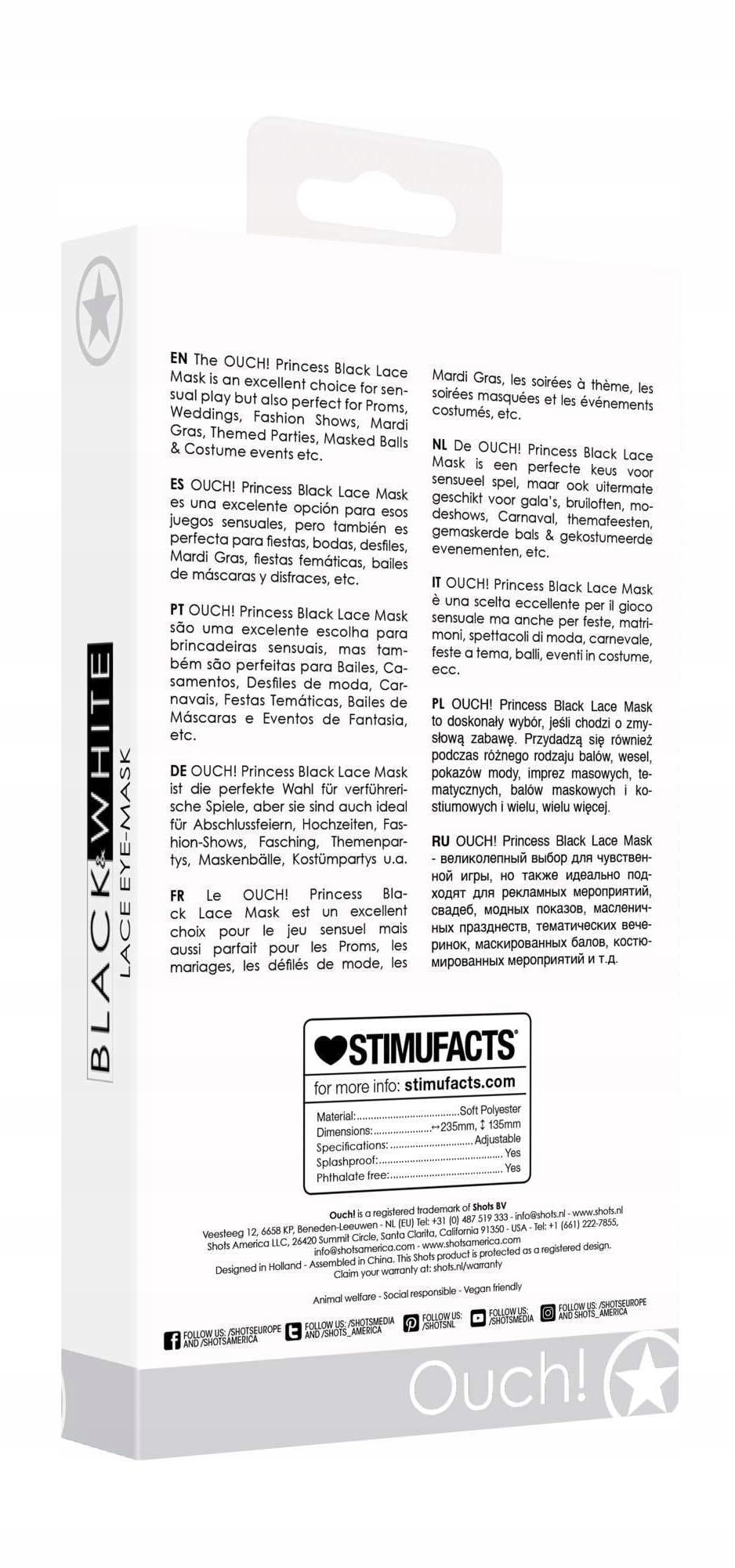 ОЙ! Черная кружевная маска Princess – идеальный выбор, когда дело доходит до чувственного удовольствия. Также он станет незаменимым дополнением во время различного рода балов, свадеб, модных показов, массовых мероприятий, тематических мероприятий, балов-маскарадов и костюмированных балов и многого-многого другого!