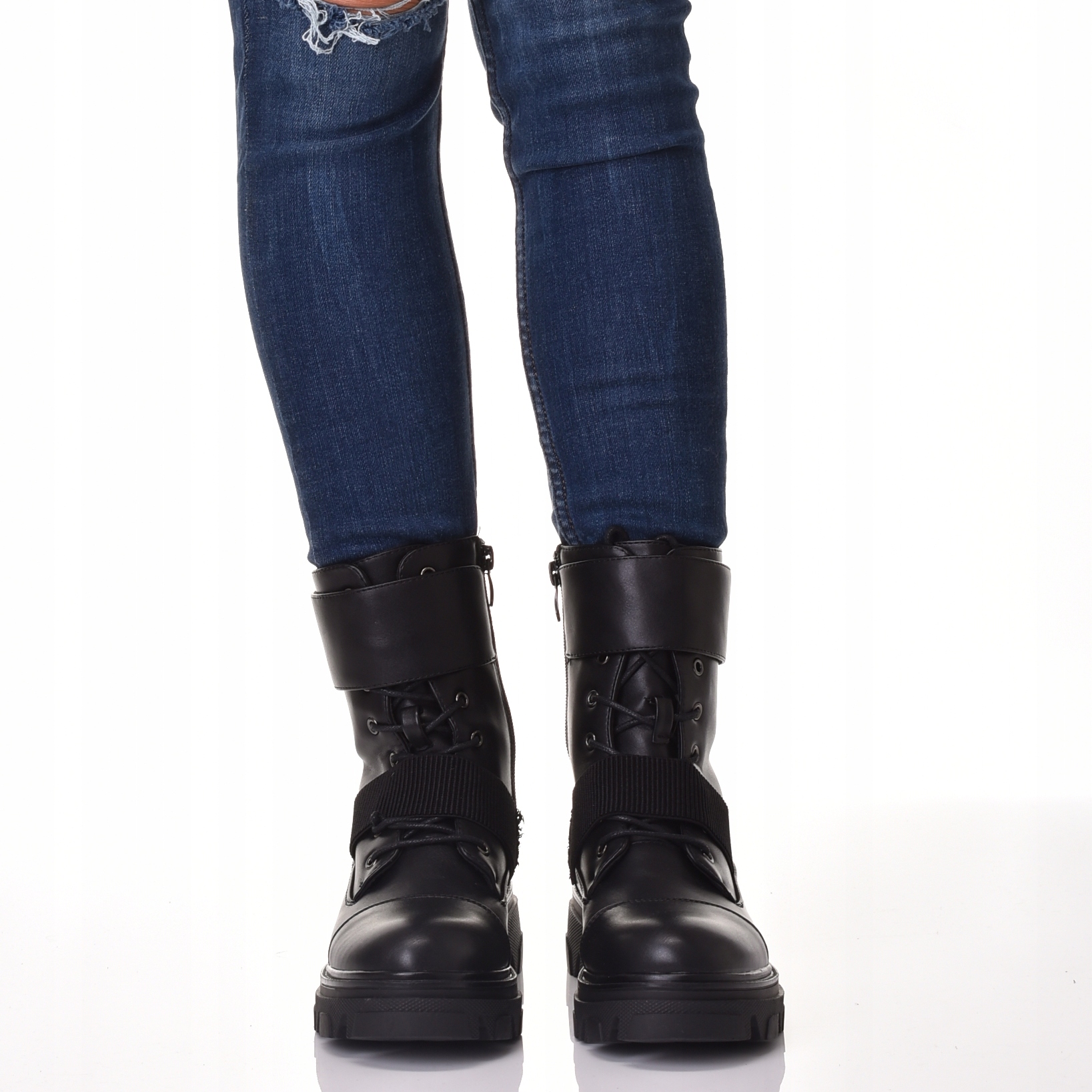 В верхней части верхней части декоративный ремень, закрепленный липучкой, который будет соответствовать обуви к ноге.