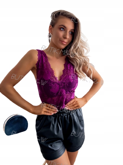 верхний кружевный фиолетовый цвет с жесткой (он зашит в бюста, без необходимости надевать нижнее белье).