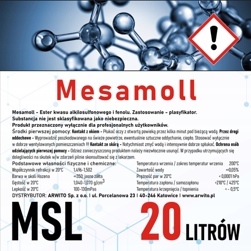 Mesamoll 20 литров – эфир высшего качества алкилсульфоновой кислоты и фенола. Применение – пластификатор. Продукт предназначен только для профессиональных пользователей. Это безфталатный пластификатор общего назначения с хорошим гелеобразующим эффектом. Совместим со многими типами полимеров, включая ПВХ, полиуретаны и резину. Вещество не классифицируется как опасное. Часто используется для промывки изоцианатного насоса и обслуживания машины в периоды простоя, а также для чистки и обезжиривания электромеханических устройств.