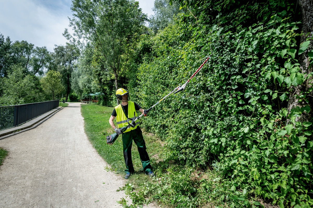 - Подстригание высоких живых изгородей и кустарников с помощью насадки-кустореза многофункциональной системы Metabo, универсальное решение для многих садовых задач.