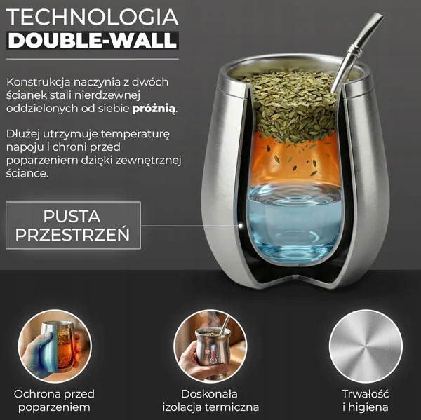 - Отличная теплоизоляция – Это основная функция. Эта технология значительно замедляет теплообмен, что позволяет напитку дольше сохранять идеальную температуру — Yerba Mate дольше остается теплым, а холодные напитки (например, терере) дольше остаются прохладными.