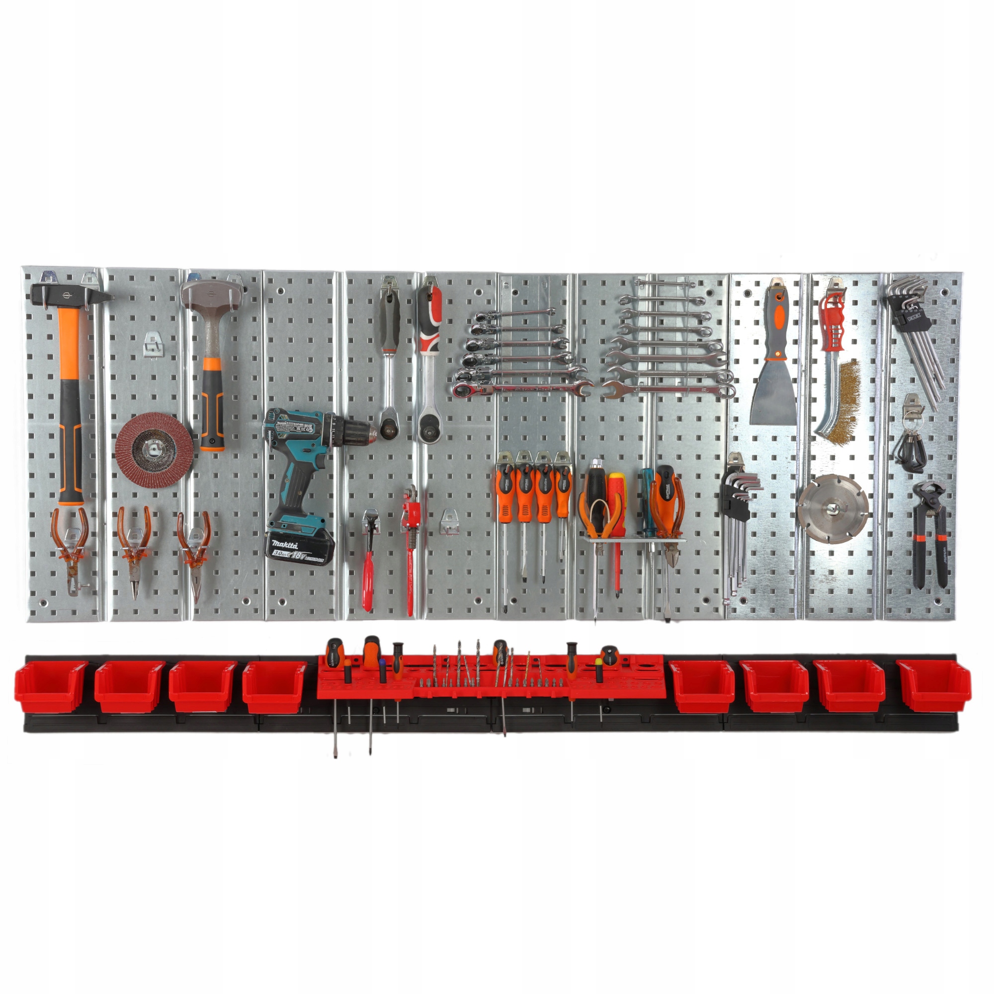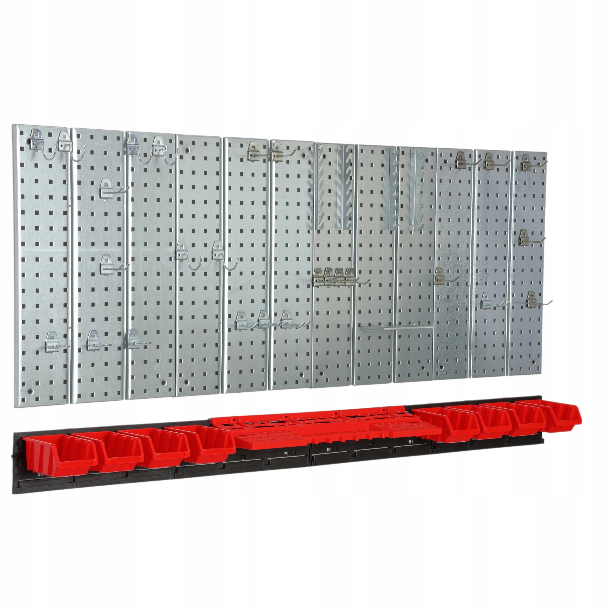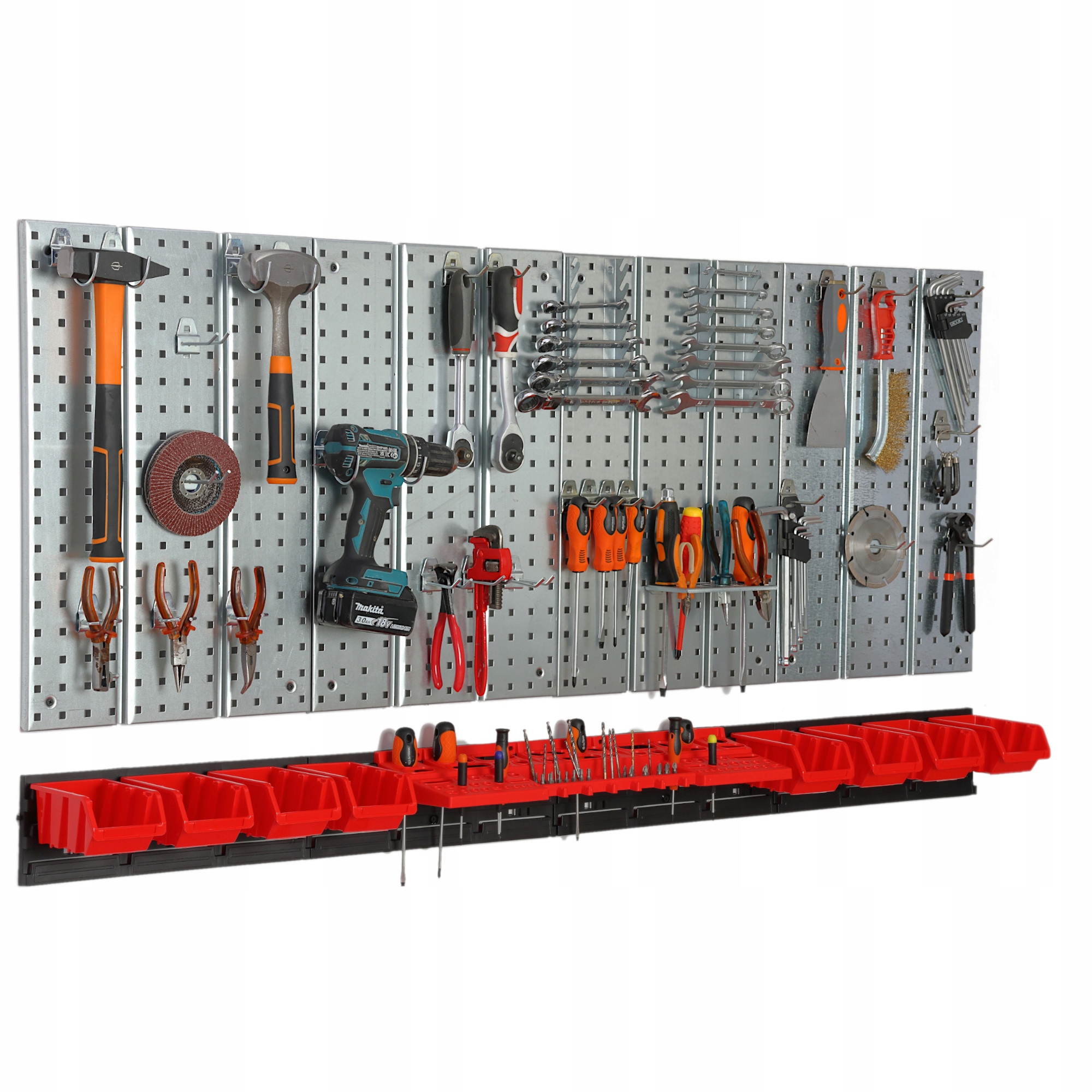 Представленный набор - это полная металлическая перфорированная плата для инструментов со всеми ручками, полками и ящиками для мусора, видимыми на картинках. (Без самих инструментов.)