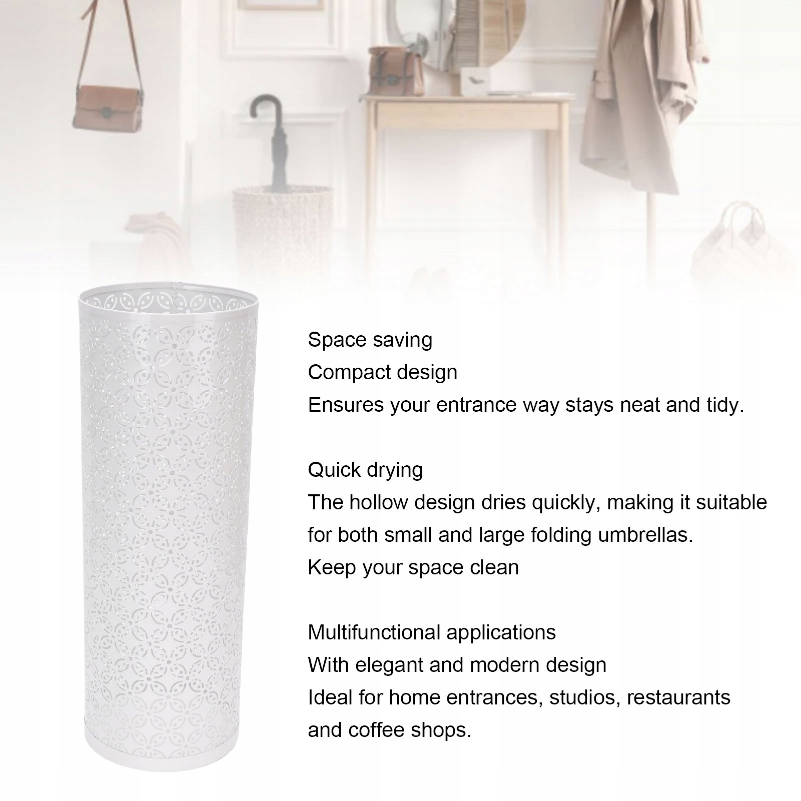 1. Сохранение пространства: Организатор зонтика имеет компактный проект, который экономит пространство при сохранении влажных зонтиков. Это практическое дополнение к вашему дому гарантирует, что ваш вход останется заказанным.