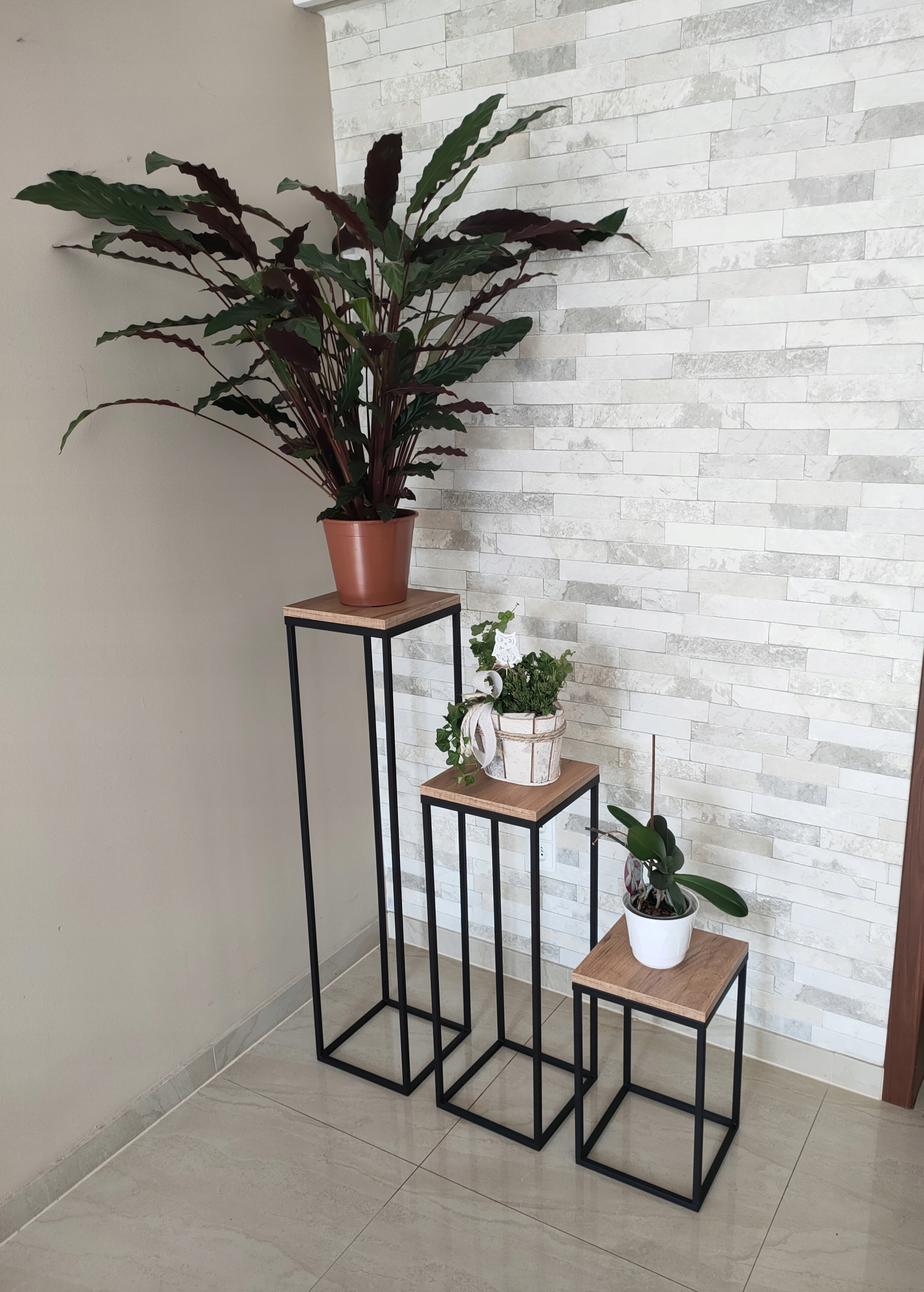 Подставка для цветов из черного металла, 70 см, со столешницей из золотого крафтового дуба