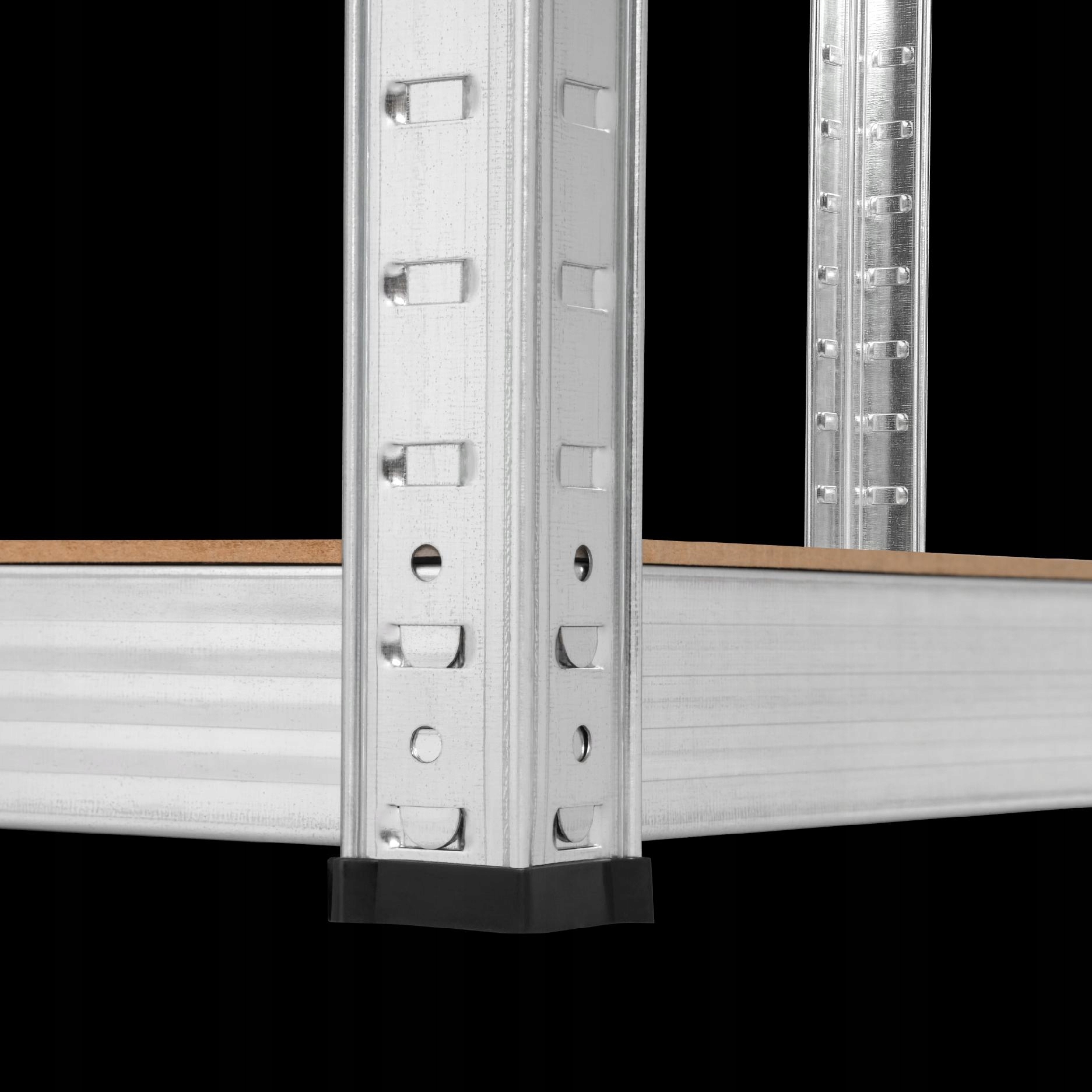 <р> Количество полок: 5 шт. <р> Полки МДФ <р> Опоры по центру <р> Оцинкованные профили <р> Толщина профиля: 0,3 мм <р> Защитные чехлы в комплекте 8 шт. <р> Максимальная нагрузка на полку: 100 кг (при равномерной нагрузке) <р> Максимальная общая нагрузка: 500 кг <р> Способ установки: безвинтовой (врезной) <р> Полку следует прикрепить к стене <р> Цвет: серебряная оцинковкаМеталлическая складская полка Rebel