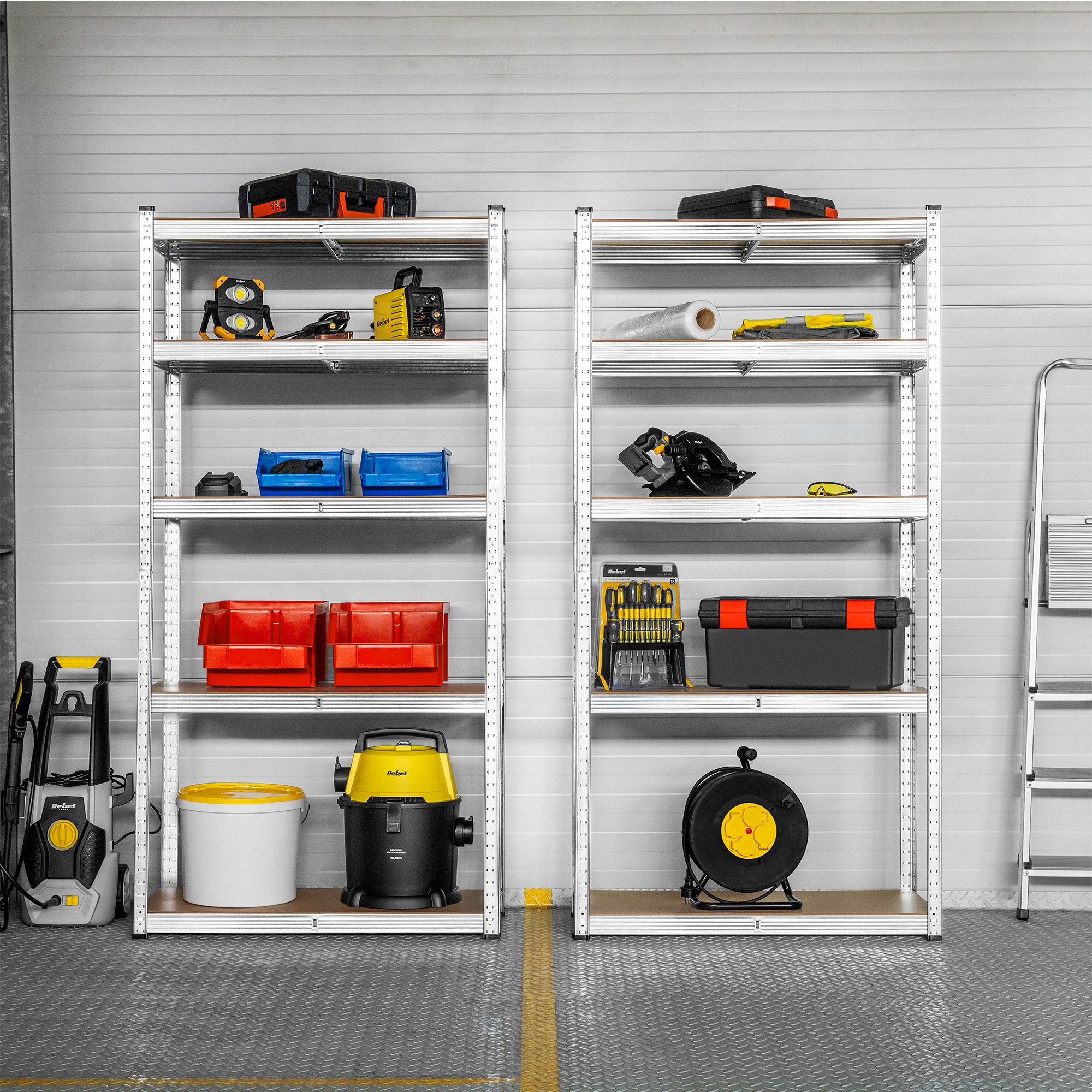 Полка для мастерской серии Rebel Tools подходит для хранения как легких, так и тяжелых предметов благодаря своей прочной конструкции из оцинкованной стали. Он оснащен 5 прочными полками, каждая из которых выдерживает нагрузку до 100 кг. Чтобы свести к минимуму риск поломки полки, равномерно распределите вес по полкам.