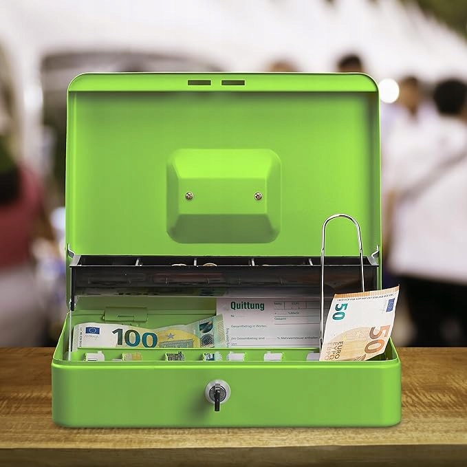 Позаботьтесь о безопасном и упорядоченном хранении денег благодаря прочной зеленой копилке Relaxdays. Независимо от того, продаете ли вы на ярмарке, мероприятии на открытом воздухе или просто хотите обезопасить свой домашний бюджет - этот металлический кассовый аппарат с замком и ключами оправдает все ваши ожидания.
