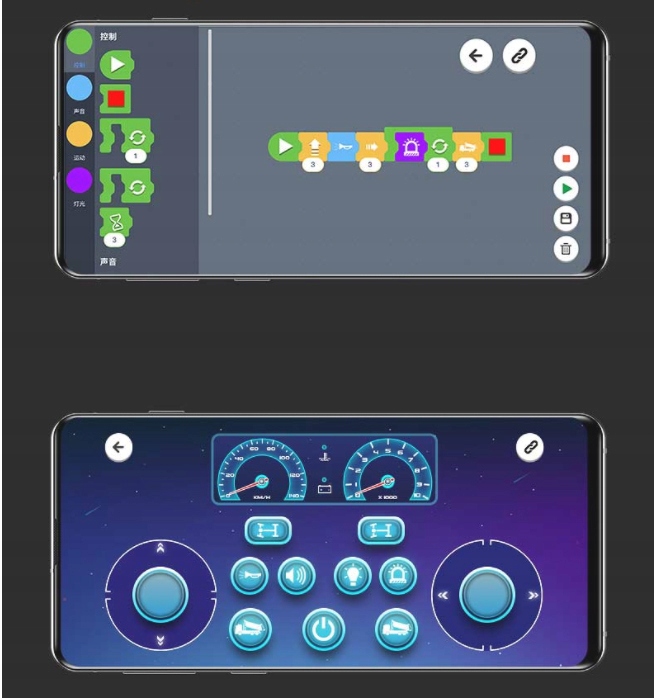 ✔ Огни и звуки : передние, верхние и задние фонари, звуки, моделирующие двигатель двигателя, рога, обратное предупреждение и другие.