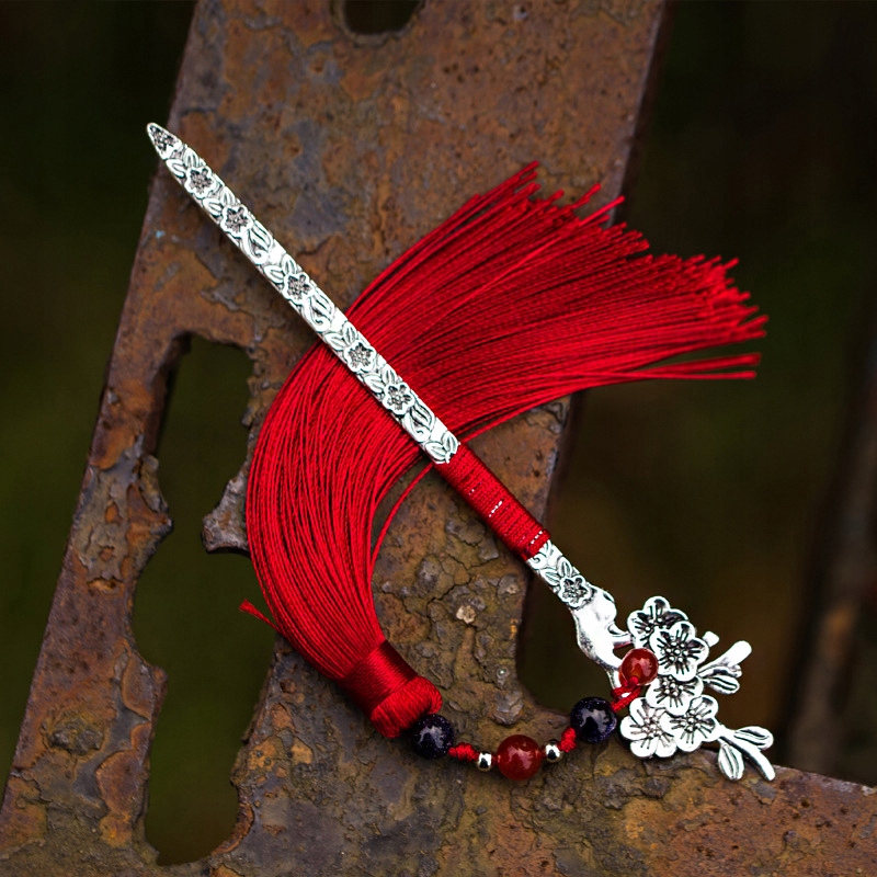 Элегантная закладка с изображением меча. Она представлена во всем изяществе, с нежными контурами и красивой бордовой бахромой.