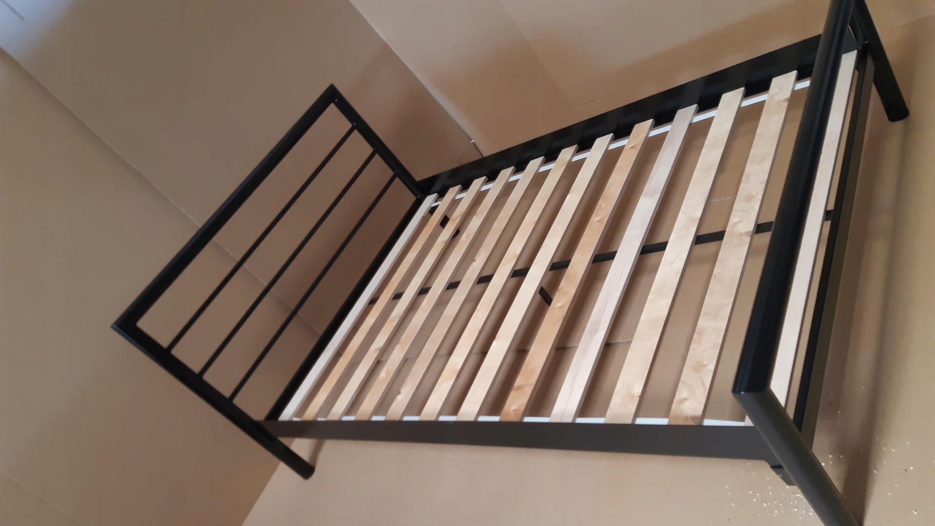 На металлическую конструкцию кровати кладем деревянную раму, а сверху укладываем матрас.