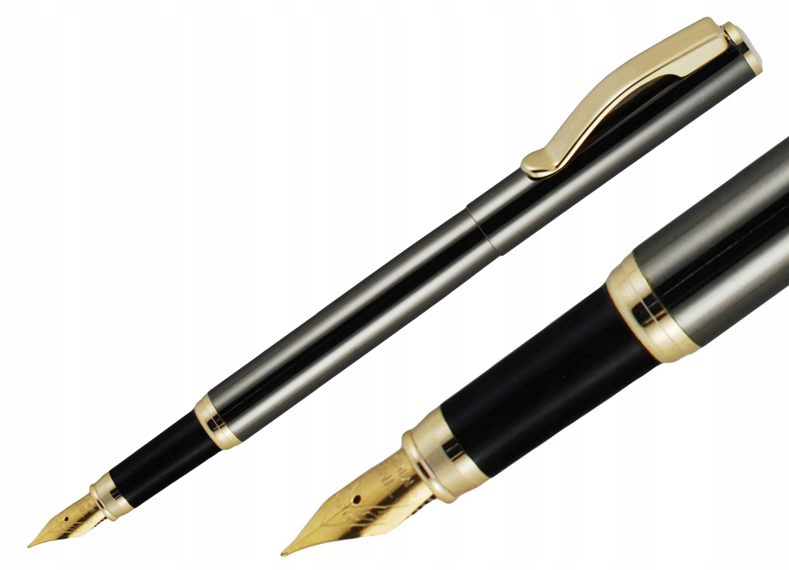 Печка с наиболее любимой простой формой. Классический NIB, украшенный, сталь среднего из самой популярной толщины. Пластиковый сталь -держатель. Корпус, насадка, кольца и зажима являются металлическими. Темно -серый лак, металлический блеск.