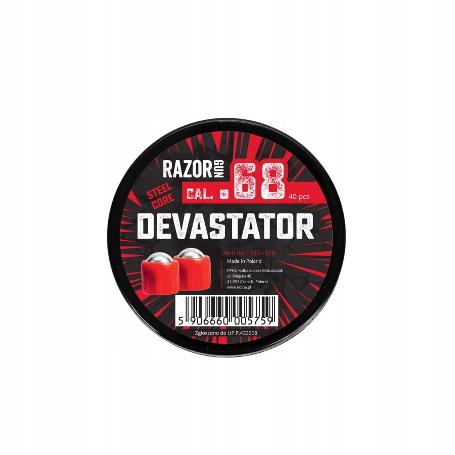 RazorGun Devastator со стальным сердечником калибра .68 40 шт., произведено в Польше. Продукт подан в Патентное ведомство.