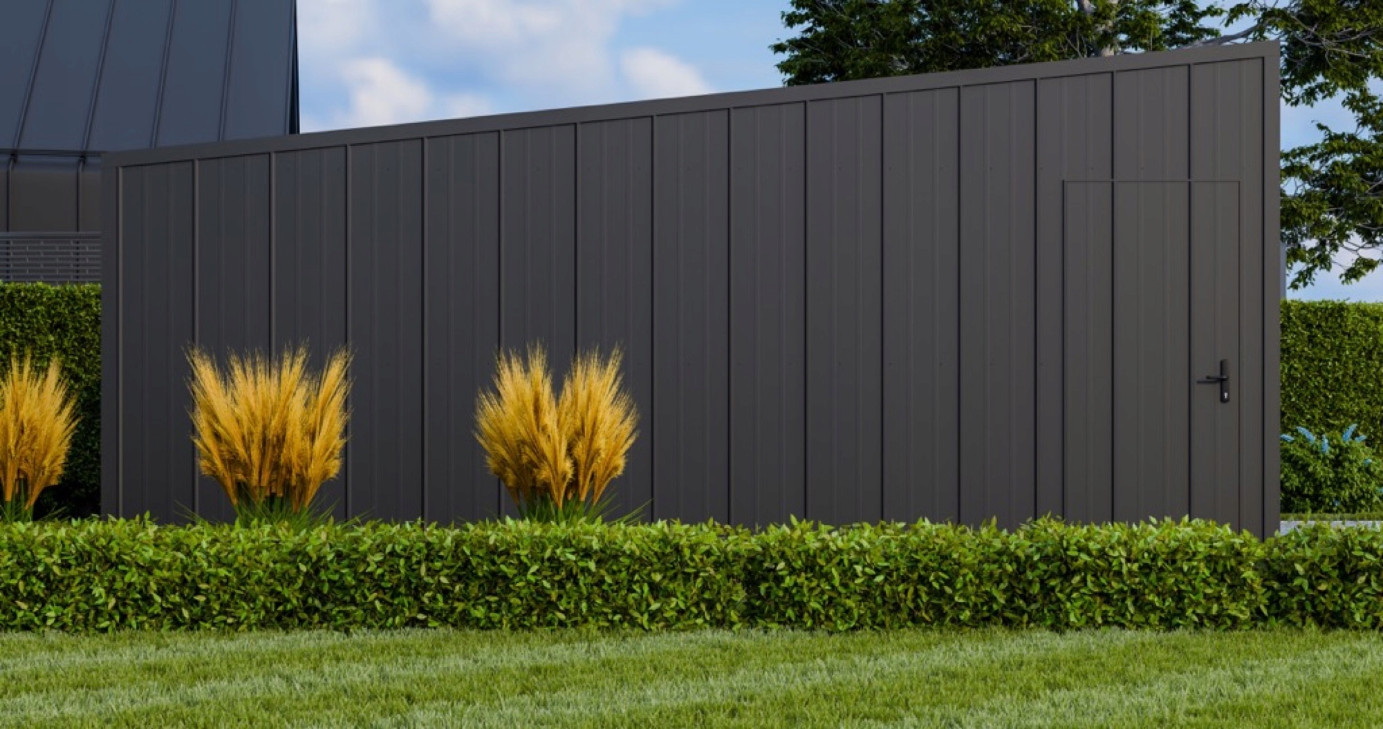 • крыша: скатная назад, обшитая фальцевым металлическим листом, цвет: антрацит матовый 7016