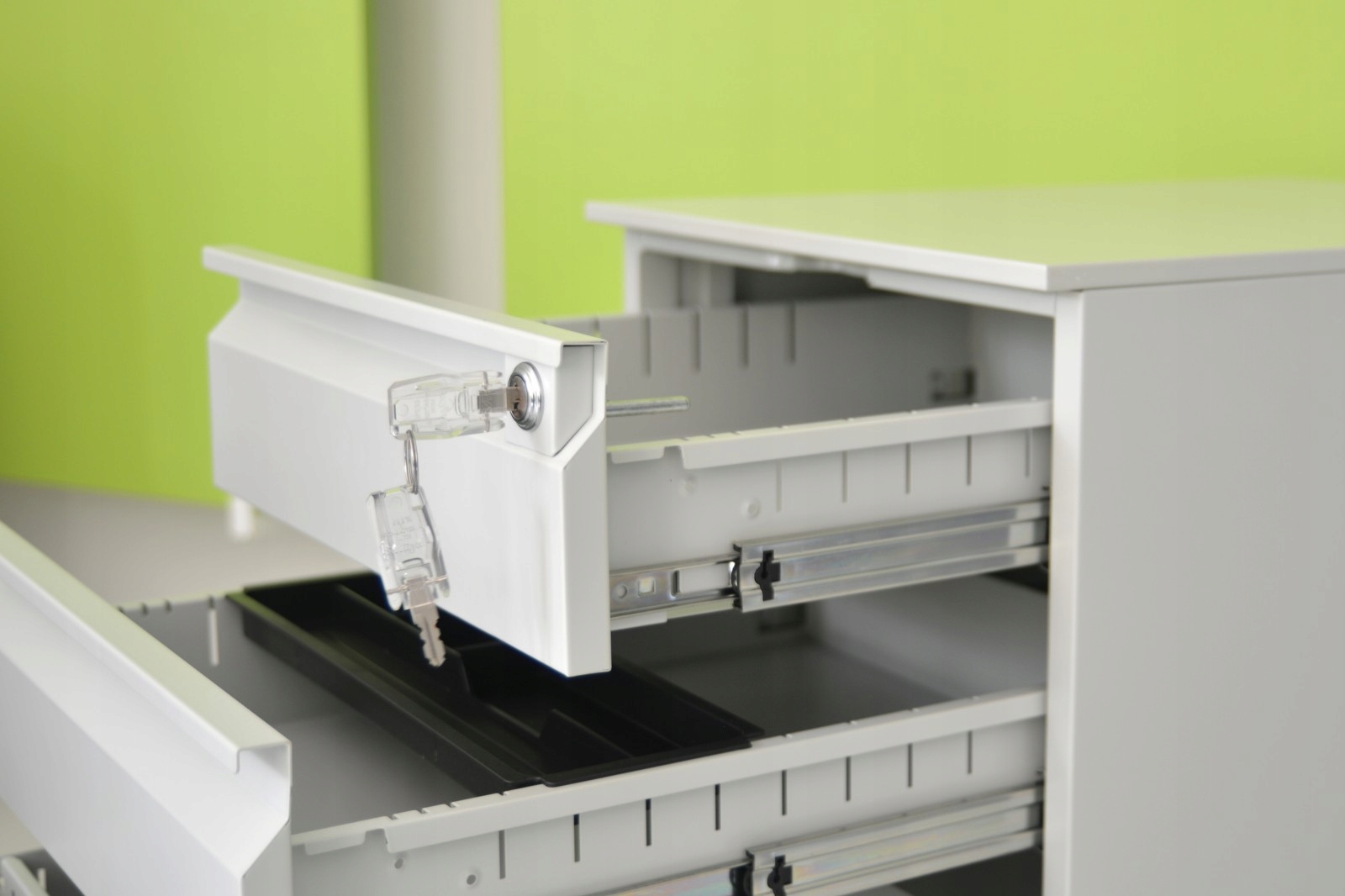 Контейнер полностью изготовлен из прочного листового металла толщиной 0,8 мм с порошковым покрытием, передняя часть разделена на 2 части. более мелкие ящики, включая вставной