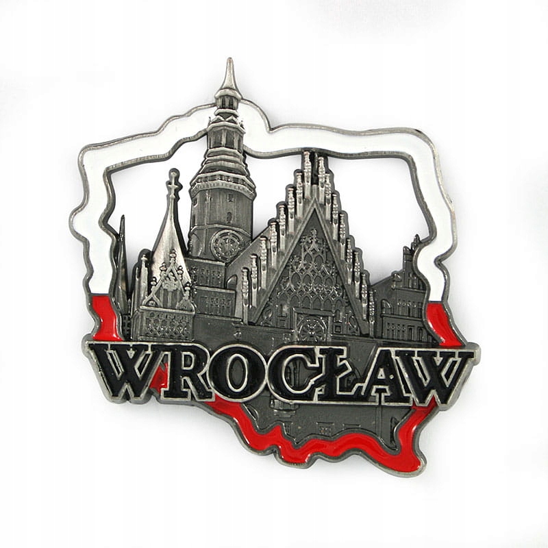 Металл, элегантный, богато украшенный, литой магнит в форме польского контура. Внутри его есть изображение ратуши Вроцлава и большая, четкая надпись «Вроцлав». Контур Польши окрашен в белый и красный, в то время как внутренняя часть карты оставалась в древнем серебре. Доступны две цветные версии: с белым или черным.